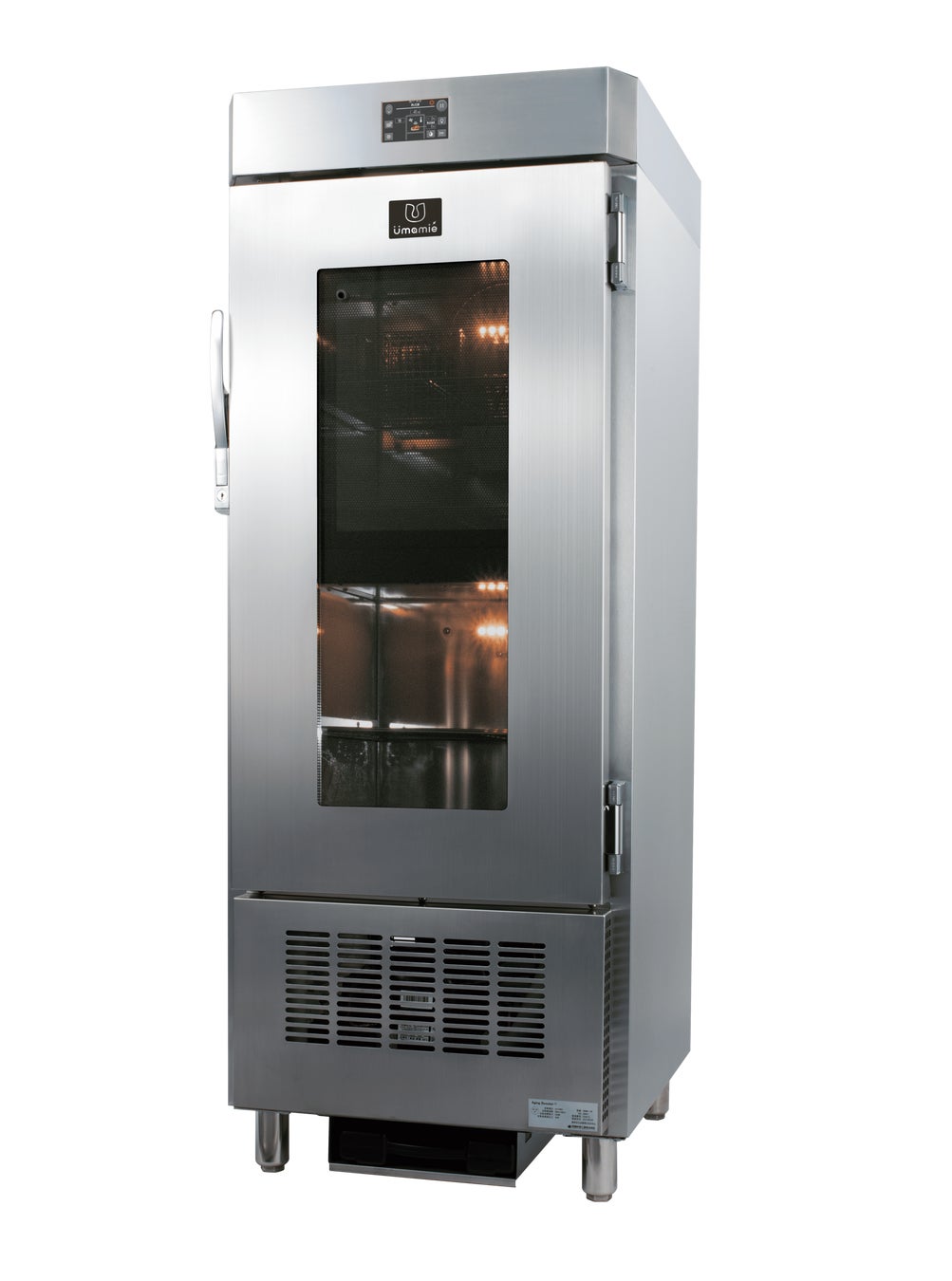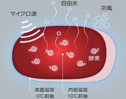 Umamiéの最大のポイントは、マイクロ波により食材内部を温めながら、冷却機能により食材表面を冷やすことにあります。食材の内部温度を上げることで酵素が活性化し、たんぱく質からアミノ酸への分解が進みます。また食材表面を冷却することで雑菌の繁殖や腐敗リスクを下げ、鮮度を維持します。さらにマイクロ波と冷風の相乗効果で食材内部の余分な水分の除去を促進します。