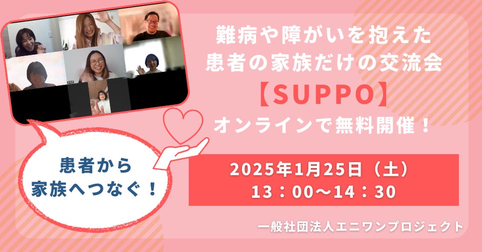 難病当事者3名が2024年11月5日に立ち上げた一般社団法人エニワンプロジェクト(本社:東京都練馬区、代表理事:狐崎友希)は、2025年1月25日(土)に難病や障がいを抱えた患者の家族(友人・支援者)だけが参加できる交流会【SUPPO(サポ)】を開催します。参加者を募集しています!本交流会は、3月8日(土)に開催する【ありがとうを伝える会】に向けて開催されるもので、患者の家族(友人・支援者)だけを対象にしたプレイベントです。「大変なのは患者だけじゃない」という想いから始まった、エニワンプロジェクトならではのオンライン交流会です。誰しも本音を話すことで余裕が生まれます。誰にでも本音は言えないけど、同じ境遇の仲間には共有できる。自分の気持ちや他の人の気持ちを受け止め、他の人の経験を学ぶことで、次の一歩を一緒に考えませんか?ぜひ、お気軽にご参加下さい。