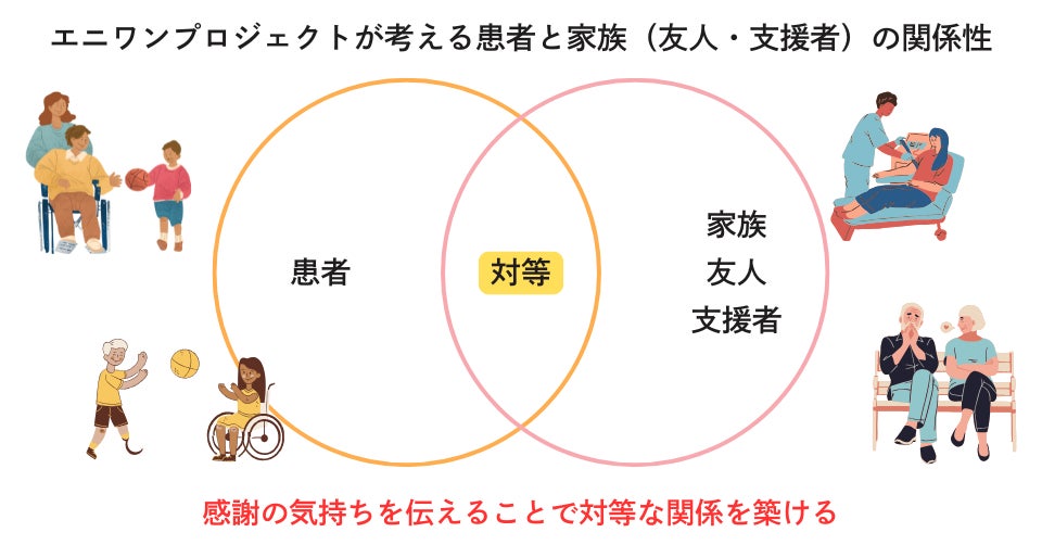 エニワンプロジェクトは、3つの交流会を開催する中で、当事者が「ごめんなさい」と言いがちな場面が多いことを実感し、支える側が「ありがとう」を聞くことで心が軽くなると感じた瞬間があり、お互いに「ありがとう」を伝え合うことが、患者と家族(友人・支援者)双方のQOLを向上させる鍵になると確信しました。
