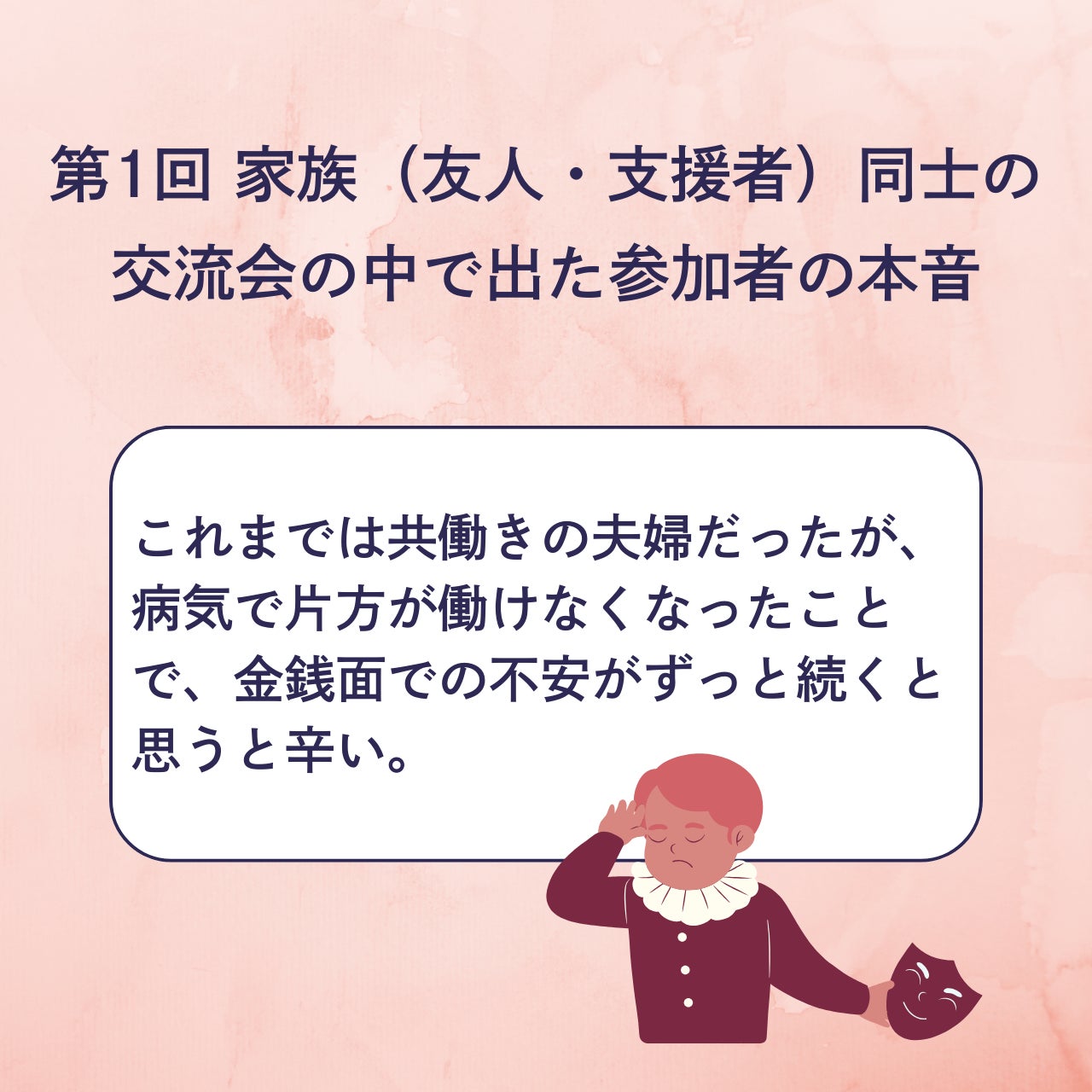 しかし気丈に振る舞う様子は、病気を抱えた家族にも無意識に伝わり、お互い遠慮し合う関係につながり悪循環が生まれます。同じ境遇の仲間に本音を共有し、共に生きる家族との未来を一緒に考えましょう。