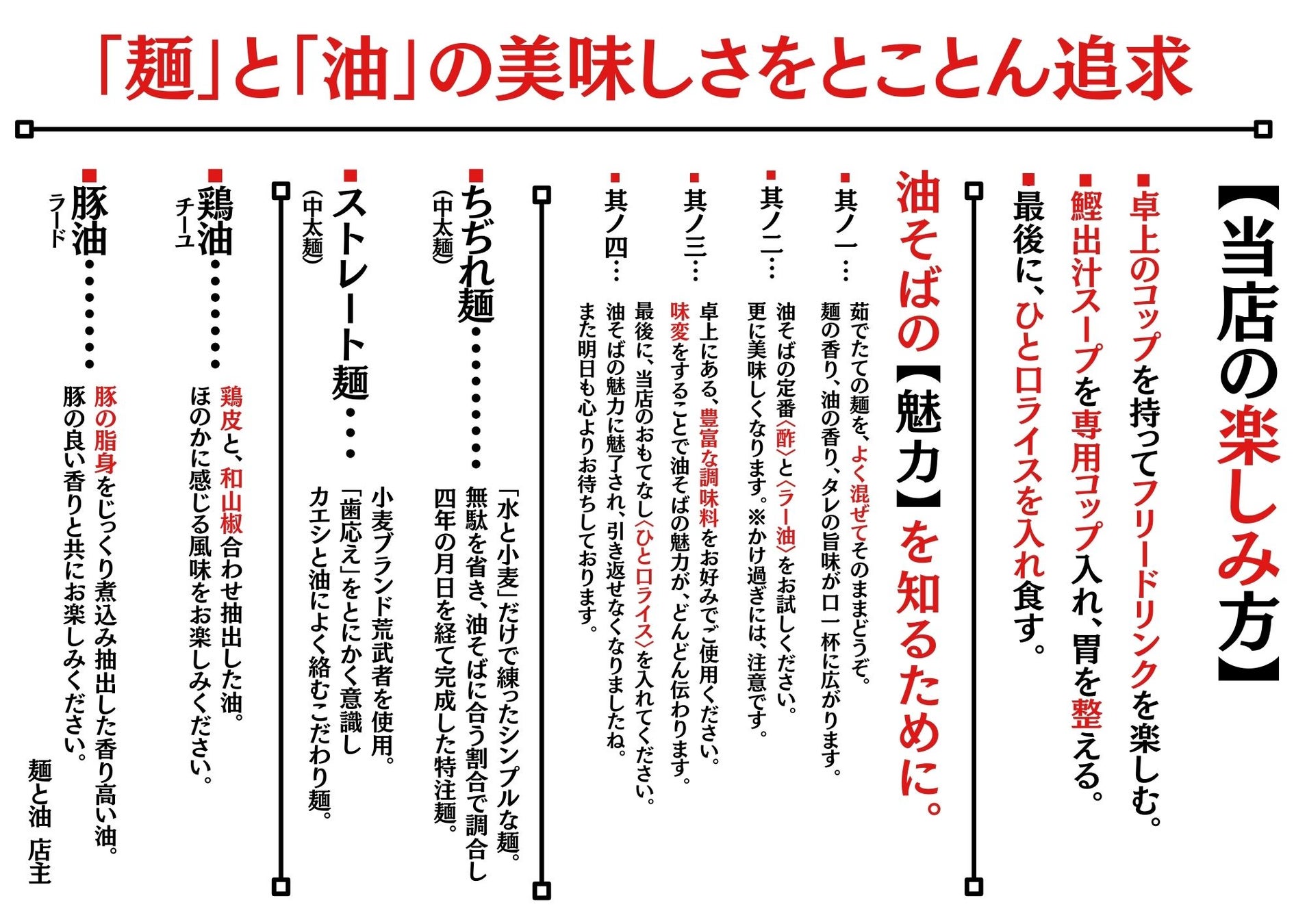 「麺と油」という店名にもあるように、当店の最大のこだわりは「麺」と「油」。