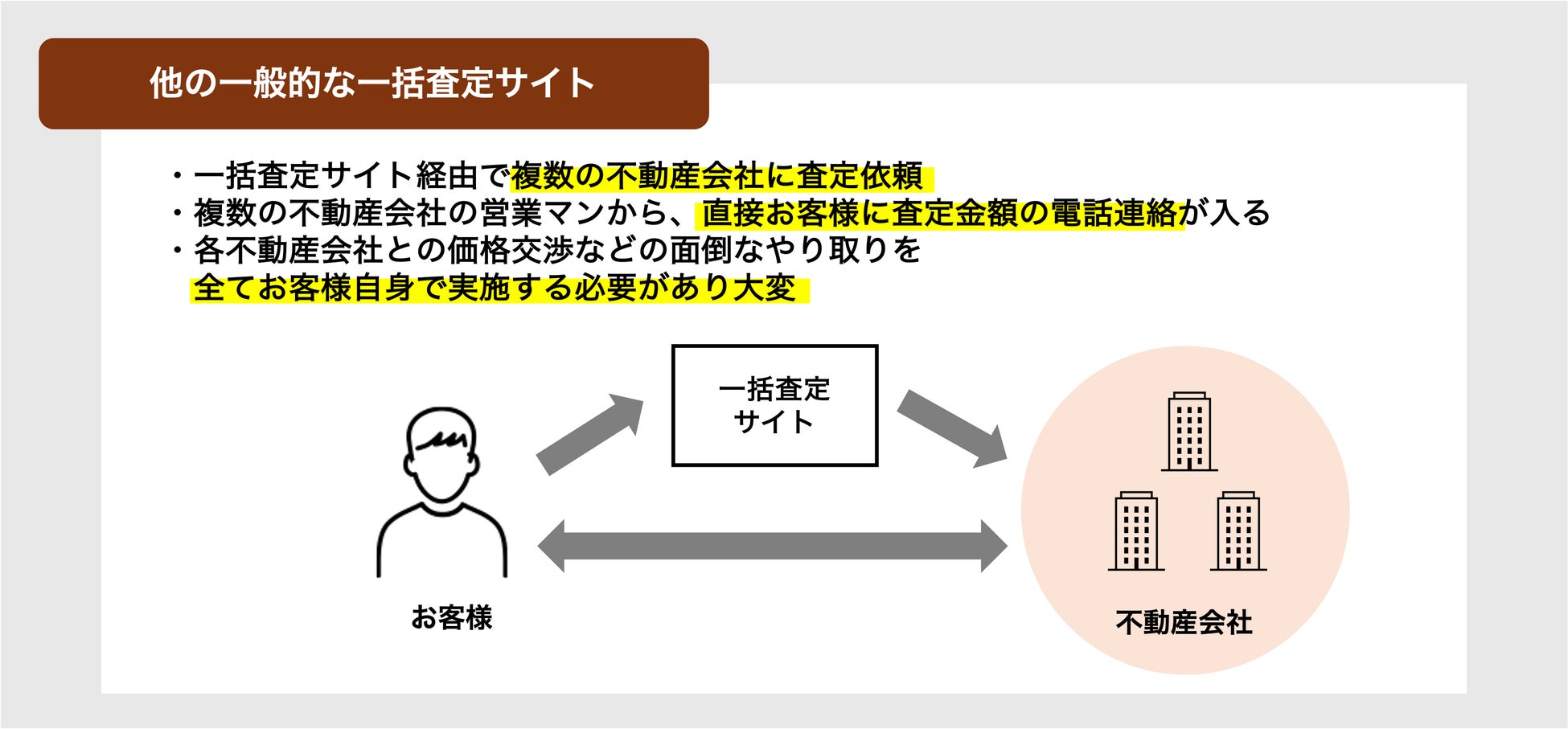 さまざまな業種で利用されている査定サイトですが、オーナー様からのお悩みとして挙げられるのが「査定依頼した次の日から複数の不動産会社からの営業電話が鳴り止まない」「不動産会社の営業マンからの押しが強くて、なかなか価格交渉ができない」「まずは査定価格を知りたかっただけなのに、強引に売却の営業をされて困惑している」など不動産会社との交渉に悩む声です。そんなお悩みを解決するのが「マンションPriceエージェント」です。オーナー様に代わって面倒なやりとりを一手に引き受けます。