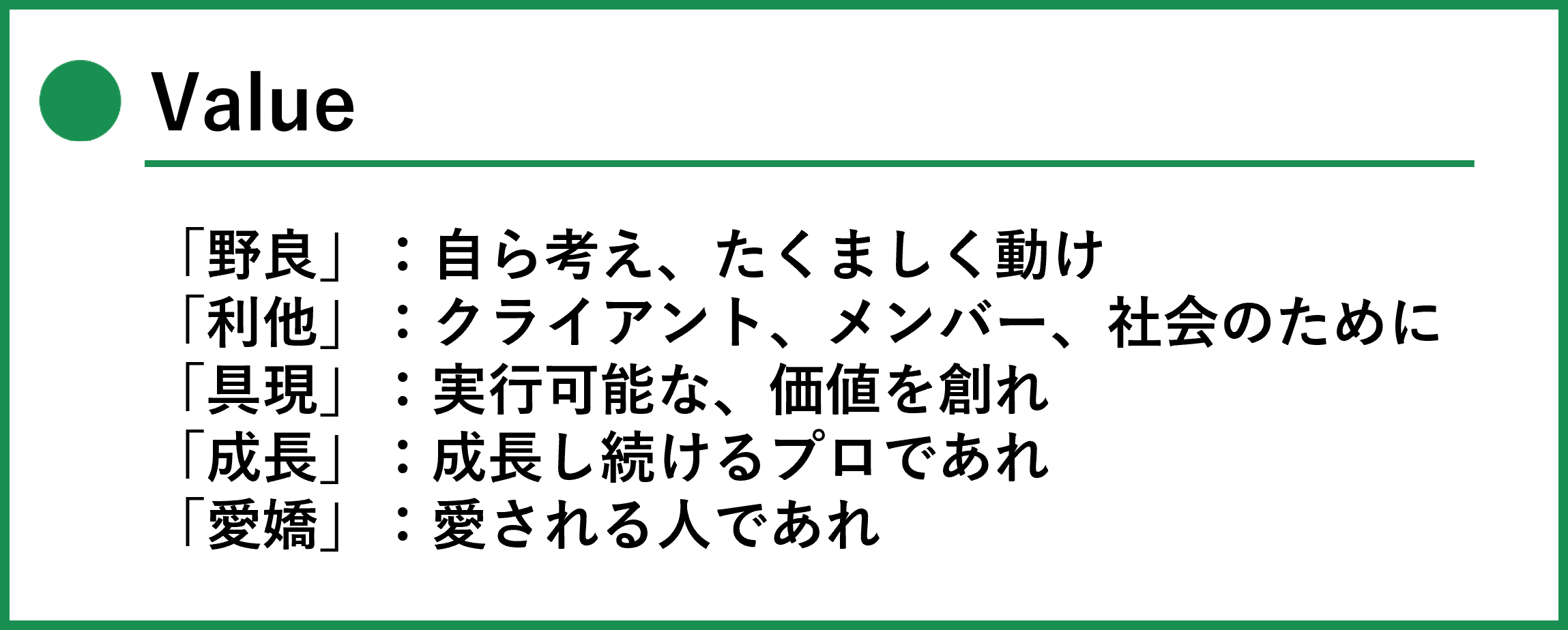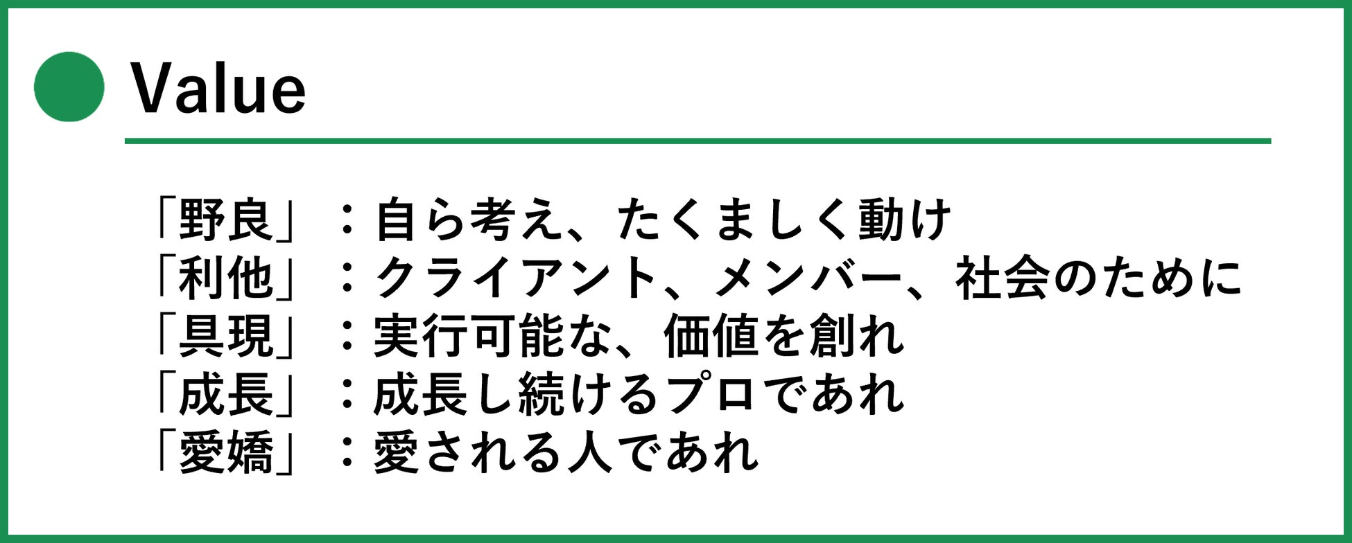 「野良」:自ら考え、たくましく動け 「利他」:クライアント、メンバー、社会のために 「具現」:実行可能な、価値を創れ 「成長」:成長し続けるプロであれ 「愛嬌」:愛される人であれ |