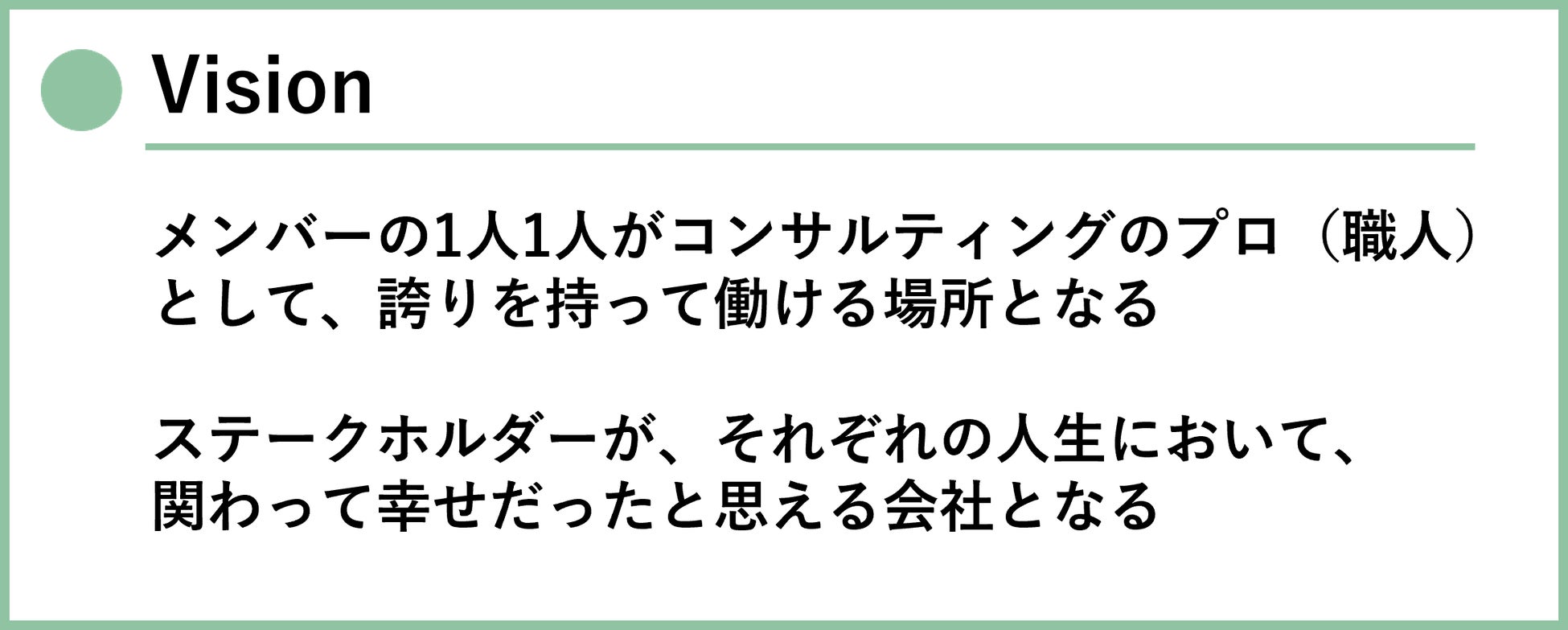 メンバーの1人1人がコンサルティングのプロ(職人)として、誇りを持って働ける場所となる。 ステークホルダーが、それぞれの人生において、関わって幸せだったと思える会社となる。 |