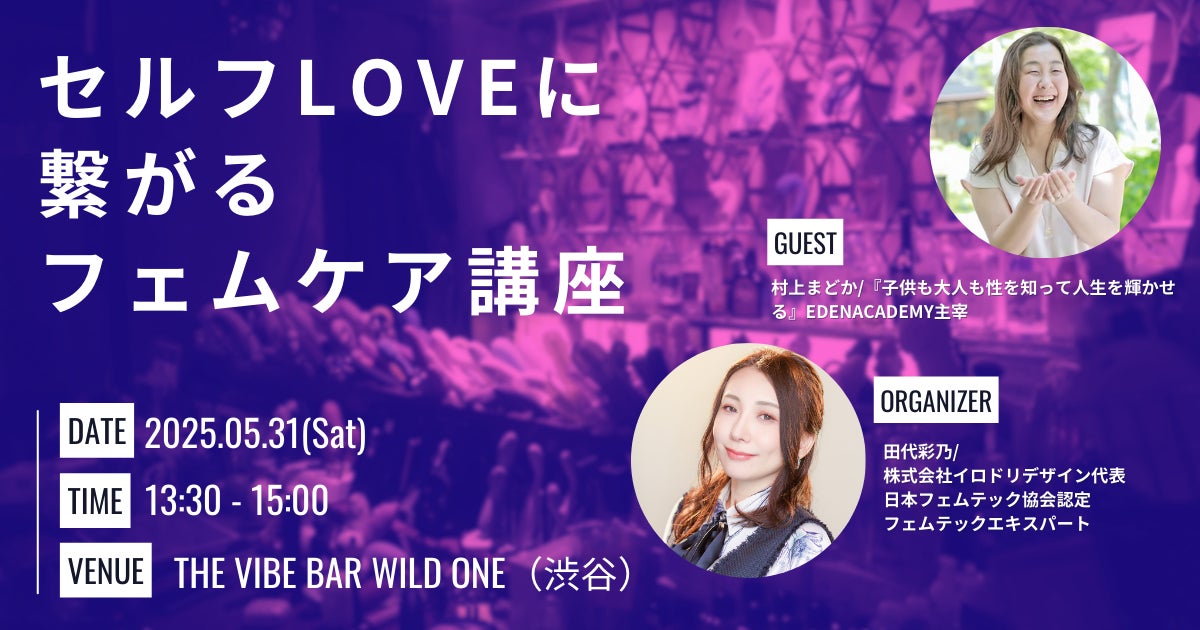 株式会社イロドリデザイン(本社:東京都渋谷区、代表取締役:田代彩乃)は、2025年5月31日(土)13:30〜15:00、渋谷「バイブバー・ワイルドワン」にて、『セルフLOVEに繋がるフェムケア講座』を開催いたします。