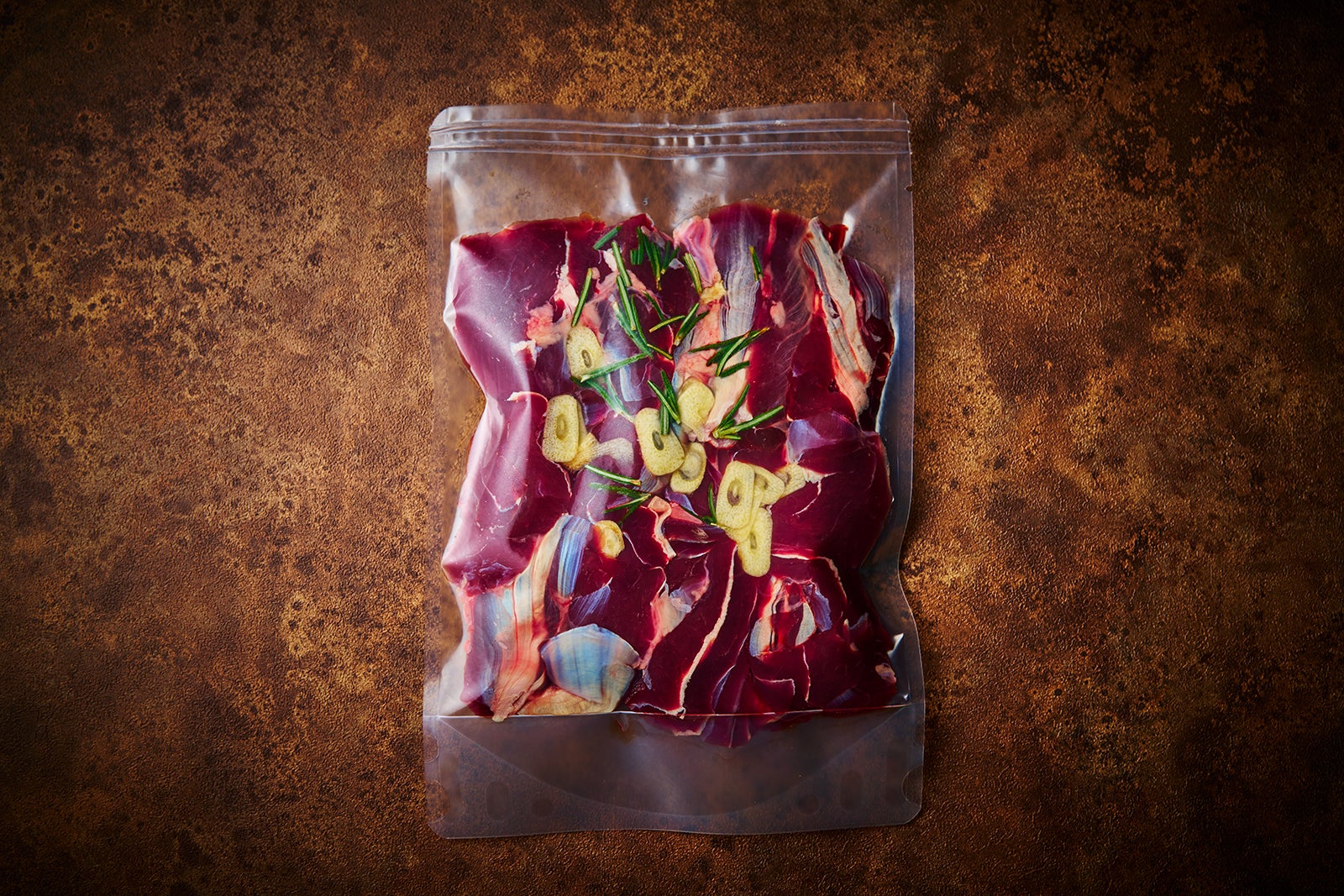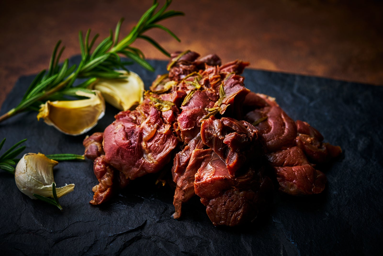 鹿のスネ肉は赤身が多く、脂はほとんどなく、よく動かす部位で肉の味も濃く、ゼラチン質も多く含む部位。 筋が多く下処理から調理までの手間がかかりますが、本商品ではすでに筋を取り、十分な柔らかさまで圧力調理をしているため すぐに料理へ使用出来ます。コンフィ風の提供やパスタソース、煮込み料理など幅広い料理へとご利用頂けます。