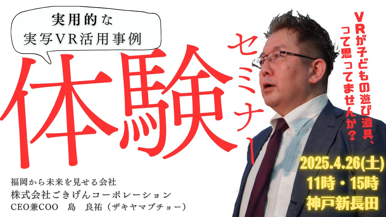 福岡市を拠点とする株式会社ごきげんコーポレーション(福岡県福岡市 CEO兼COO:島良祐 以下、「当社」)は。毎月【VR体験セミナー】を各地で開催しているが、4月26日に神戸市新長田の兵庫県立大学新長田ブランチにて開催することを発表した。同セミナーは福岡市以外でも全国各地でこれまで開催されてきたが、神戸での開催は初となる。