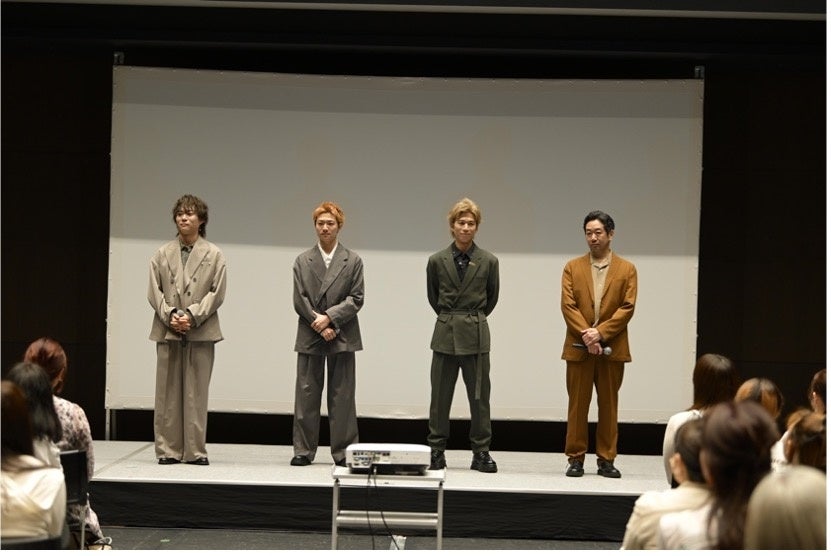 会場がほぼ⼥性に埋め尽くされた映画「熊本の彼⽒」の舞台挨拶には、TikTok ⼈気アカウント「熊本の彼⽒」こと杉本琢弥さん、熊⾕祐紀さん、諸星翔希さん、⼩⼭銀次郎さんが登壇。熊本地震からの復興に⼒を注ぐ熊本を舞台にする、杉本さんの楽曲をモチーフとしたオリジナルストーリーとなる本作について、撮影の様⼦から、⾳楽やダンス、役作りまで幅広いトークで観客の興味を惹きつけました。