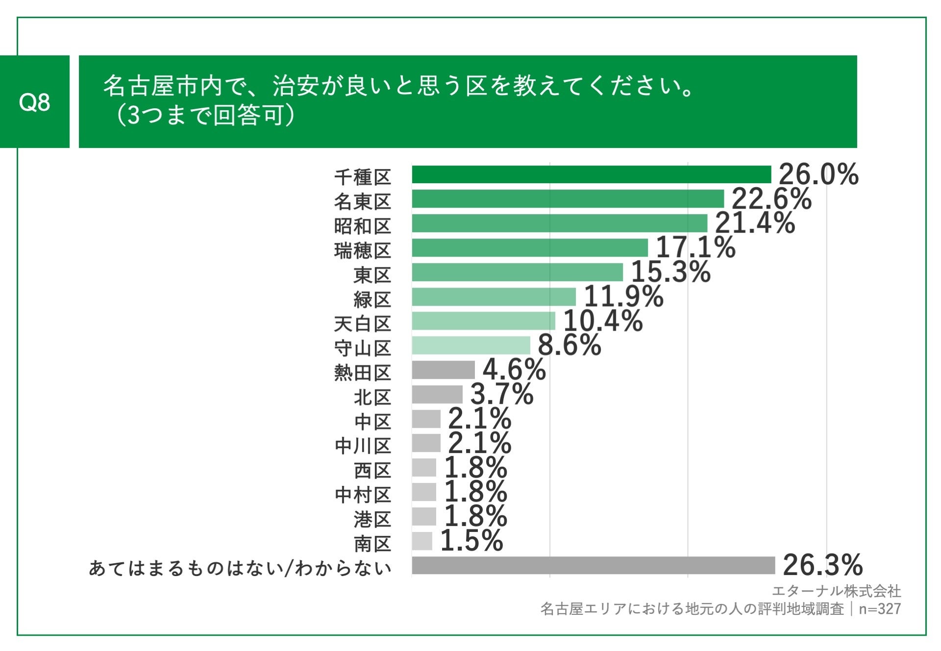 「Q8.名古屋市内で、治安が良いと思う区を教えてください。(3つまで回答可)」(n=327)と質問したところ、「千種区」が26.0%、「名東区」が22.6%、「昭和区」が21.4%という回答となりました。