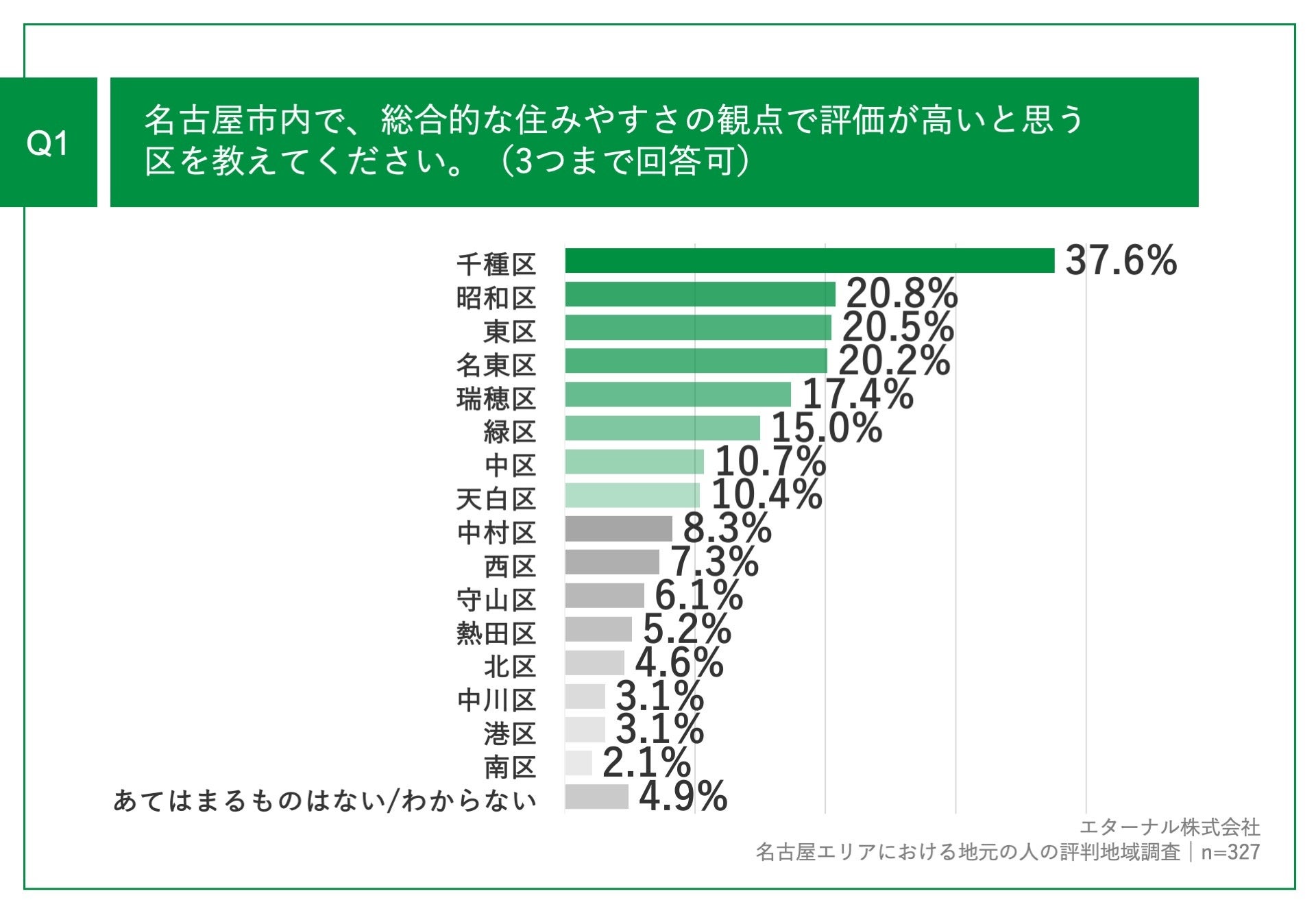 「Q1.名古屋市内で、総合的な住みやすさの観点で評価が高いと思う区を教えてください。(3つまで回答可)」(n=327)と質問したところ、「千種区」が37.6%、「昭和区」が20.8%、「東区」が20.5%という回答となりました。