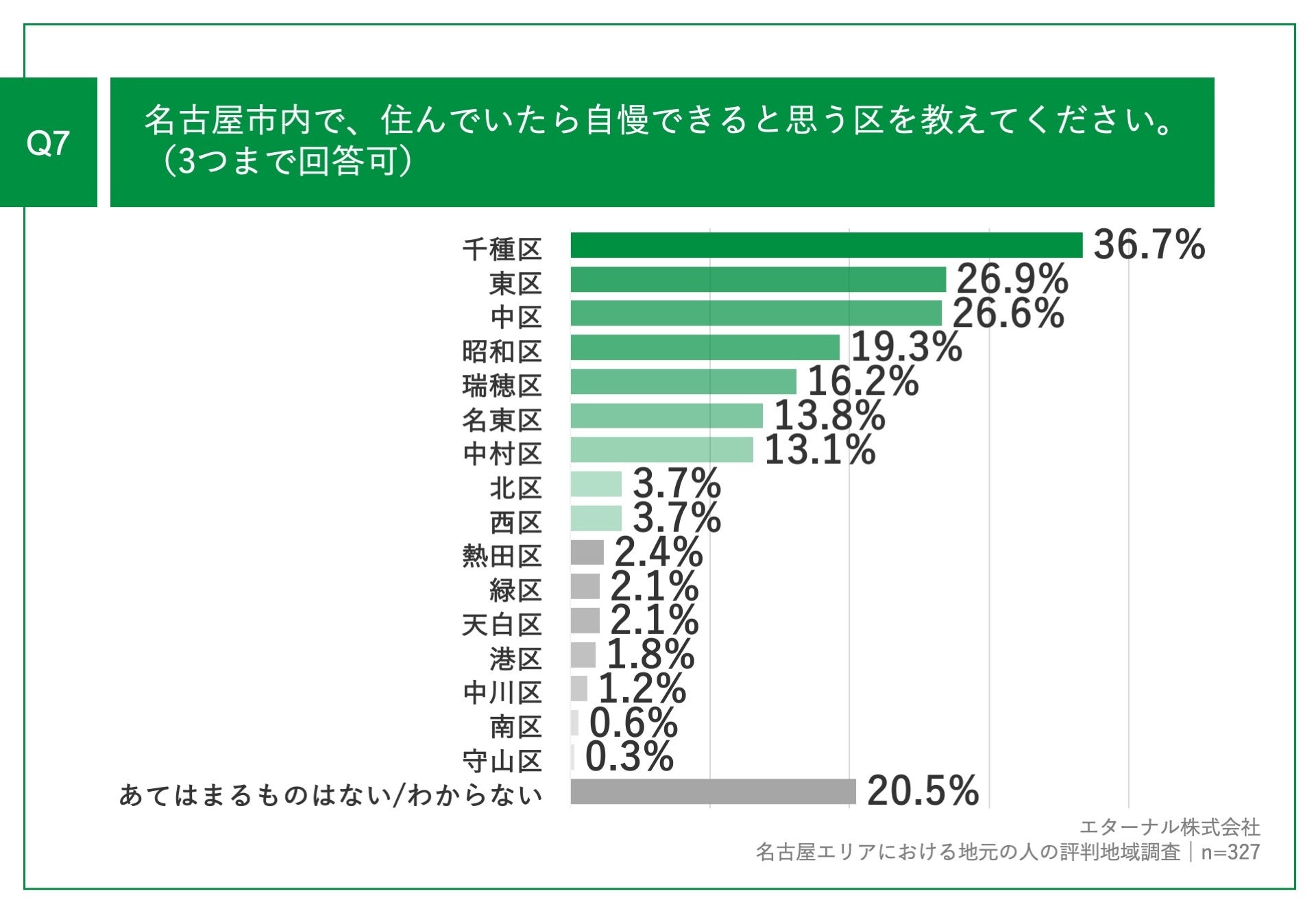 「Q7.名古屋市内で、住んでいたら自慢できると思う区を教えてください。(3つまで回答可)」(n=327)と質問したところ、「千種区」が36.7%、「東区」が26.9%、「中区」が26.6%という回答となりました。