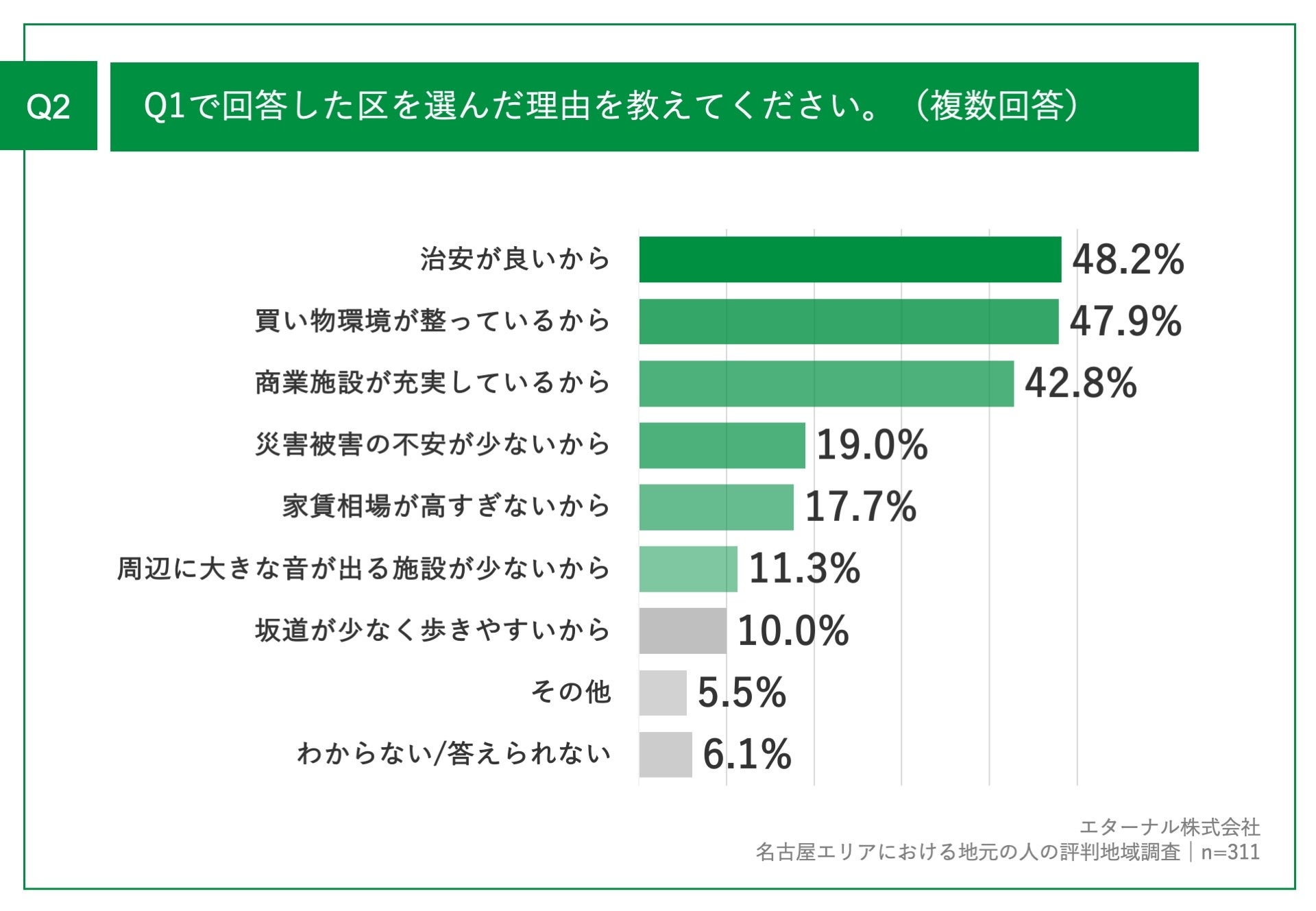 Q1で「あてはまるものはない/わからない」以外を回答した方に、「Q2.Q1で回答した区を選んだ理由を教えてください。(複数回答)」(n=311)と質問したところ、「治安が良いから」が48.2%、「買い物環境が整っているから」が47.9%、「商業施設が充実しているから」が42.8%という回答となりました。