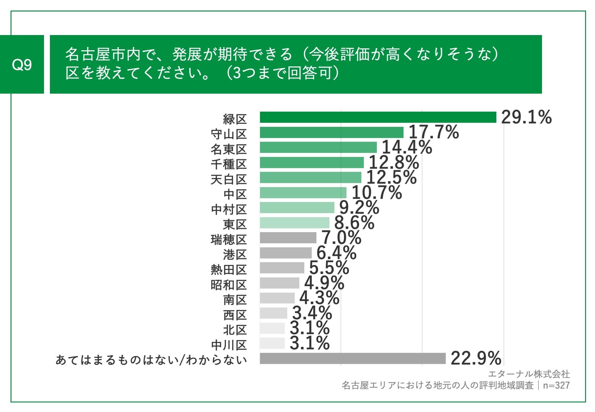 「Q9.名古屋市内で、発展が期待できる(今後評価が高くなりそうな)区を教えてください。(3つまで回答可)」(n=327)と質問したところ、「緑区」が29.1%、「守山区」が17.7%、「名東区」が14.4%という回答となりました。