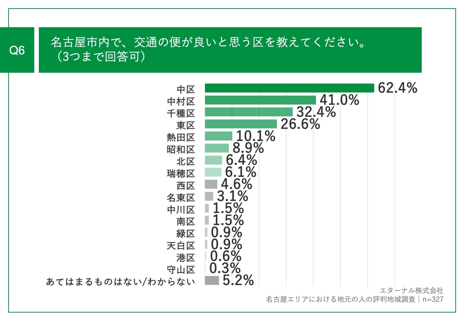 「Q6.名古屋市内で、交通の便が良いと思う区を教えてください。(3つまで回答可)」(n=327)と質問したところ、「中区」が62.4%、「中村区」が41.0%、「千種区」が32.4%という回答となりました。