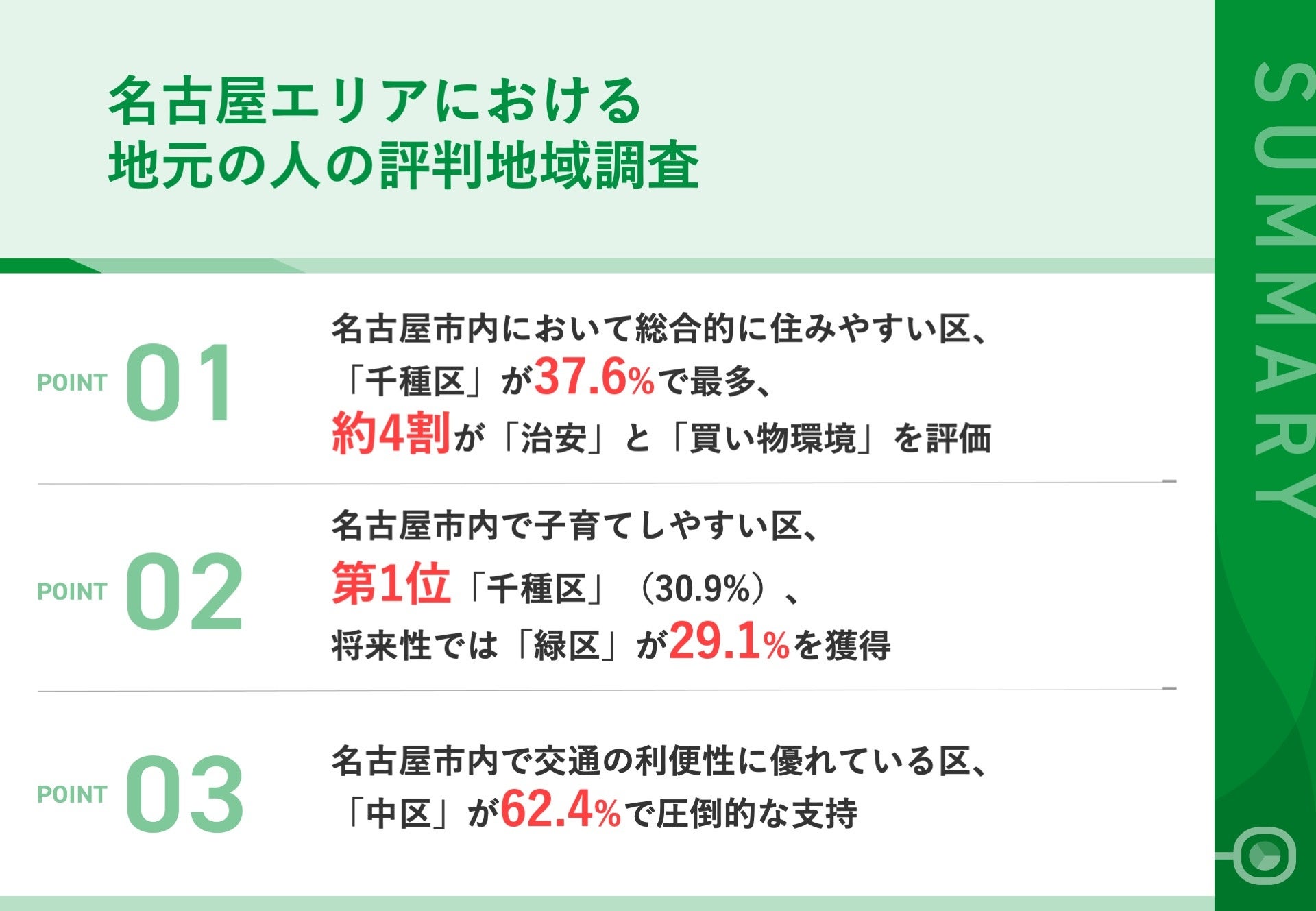 02|名古屋市内で子育てしやすい区、第1位「千種区」(30.9%)、将来性では「緑区」が29.1%を獲得