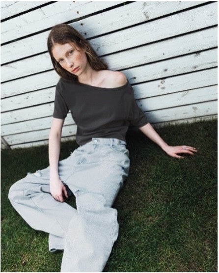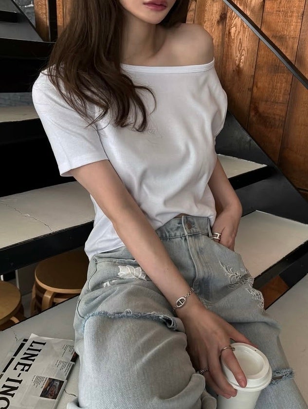 ボートネックデザインなので、ノーマルにTシャツとしての着用はもちろん、ワンショルでの着用も可能です。