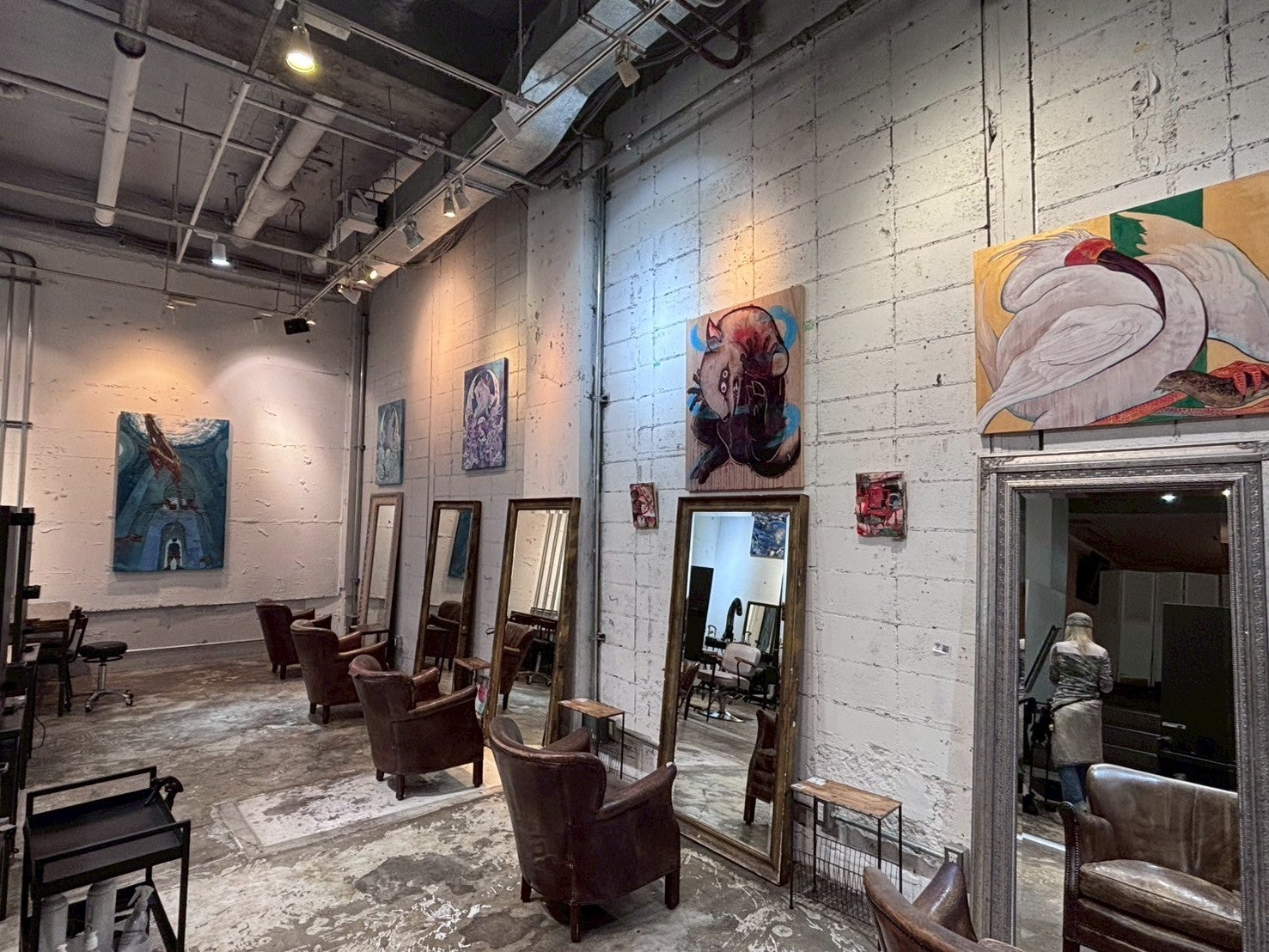 ※美容院の通常営業中に展示を行います。南青山エリアにあるNORA HAIR SALONは、高い天井と開放的な空間を備えたスタイリッシュな美容室です。普段から店内にアート作品を展示しており、来店者がまるで美術館にいるかのような感覚を味わえるユニークなサロンとして知られています。今回、その空間をギャラリーとして活用することで、美容室とアートの新たなコラボレーションの形を提示します。