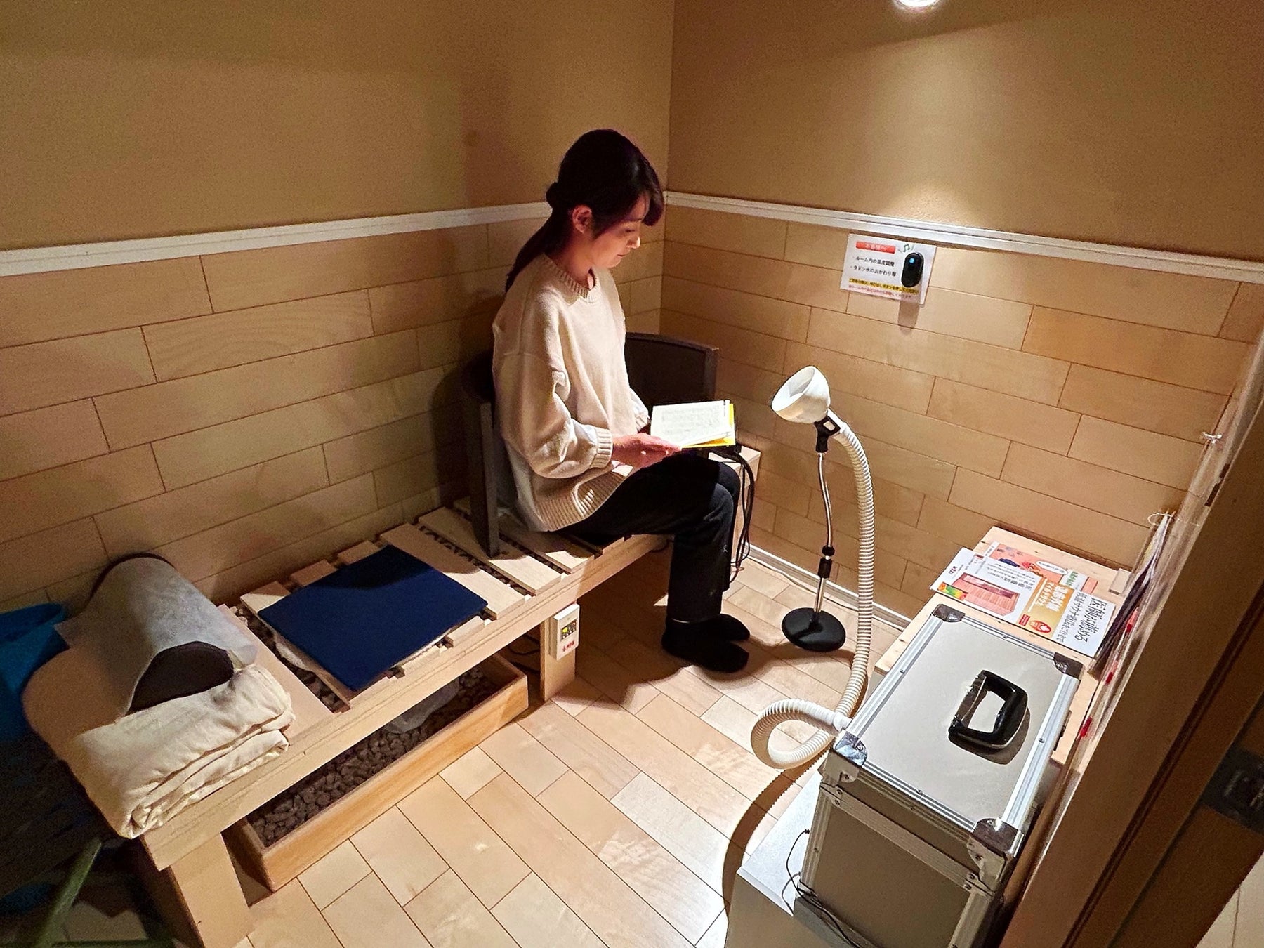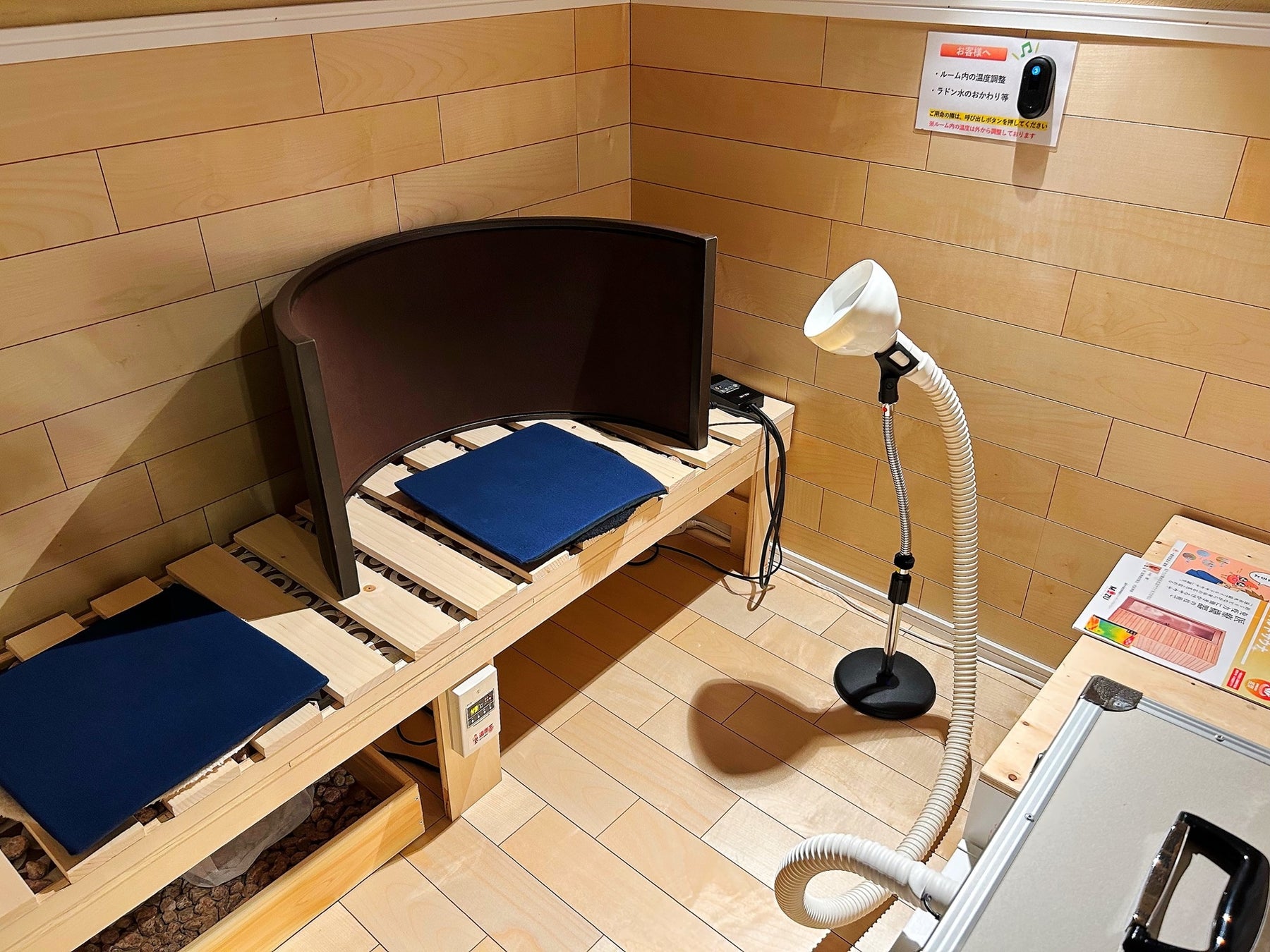 「温浴」と銘打っていますが、室内を温めているのは医療機器にも使われている遠赤外線シート「おひさまシート」で、普段着のまま入れるのが特徴です。