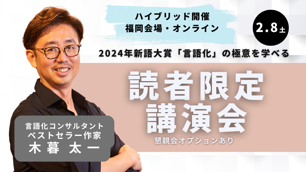 2025年2月8日(土)、言語化コンサルタントでありベストセラー作家の木暮太一が、新刊『リーダーの言語化─「あいまいな思考」を「伝わる言葉」にする方法』の出版を記念して、福岡で読者限定の講演会を開催します。本講演会は、会場での参加とZoomを通じたオンライン参加の両方が可能な「ハイブリッド開催」となります。さらに、講演後には著者を囲んだ懇親会も予定。直接、書籍のテーマや出版秘話を聞ける貴重な機会です。