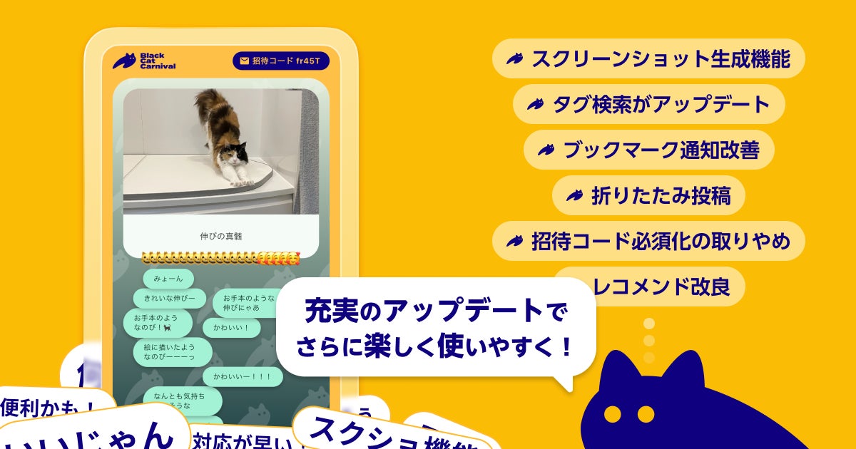 ブラックキャット・カーニバル(略称 ブラキャニ)は、これまで「フォローありきの関係が窮屈」「誰も構ってくれなくてさみしい」といった従来のSNSの煩わしさを解消し、スワイプ操作だけで気軽にコミュニケーションが楽しめるショートSNSです。