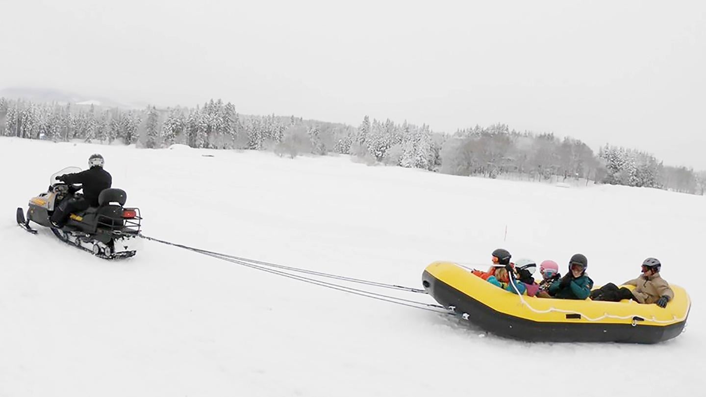 スノーモービルに取り付けた雪上ラフティングボートに乗って、雪原をお楽しみいただけます。