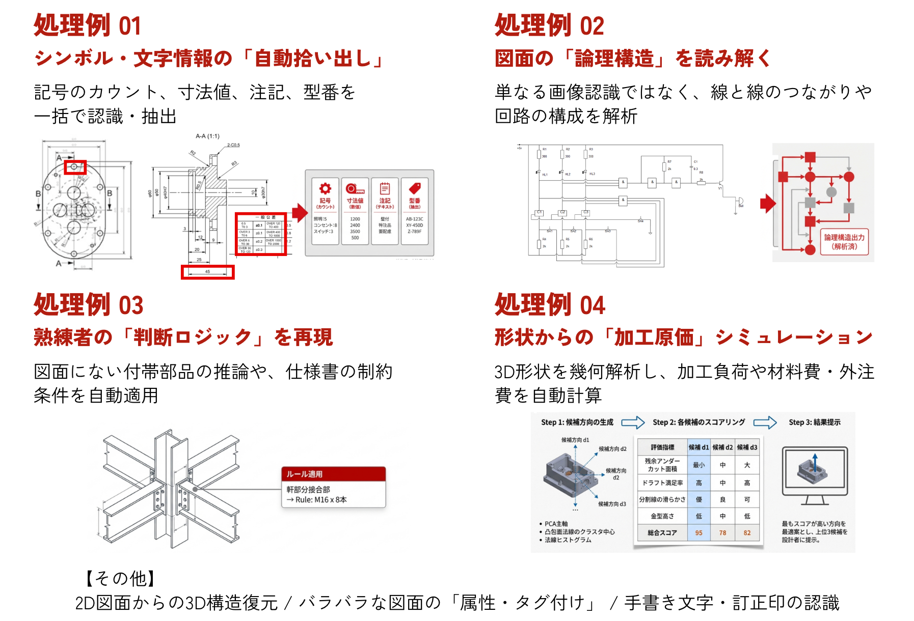 本事業では、図面PDFや2D/3D CADデータを解析し、見積作業や図面チェックといった、製造業において属人化しやすい業務の自動化・効率化を支援します。