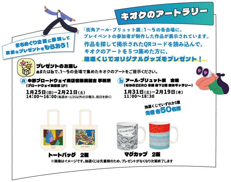 「街角アール・ブリュット展」の5会場をめぐりながら対象の作品を探し、掲示されたQRコードを読み込んで「キオクのアート」を5つ集めた方に、抽選くじでオリジナルグッズをプレゼントします。