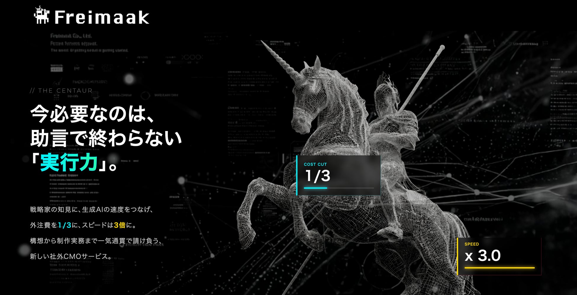 Freimaak(フライマーク)株式会社(本社:東京都中央区、代表取締役:遠藤 明豊)は、BtoB企業専門に、戦略設計から実務・実装までをワンストップで提供する次世代型の社外CMOサービス『THE CENTAUR(セントール)』の正式提供を開始いたします。