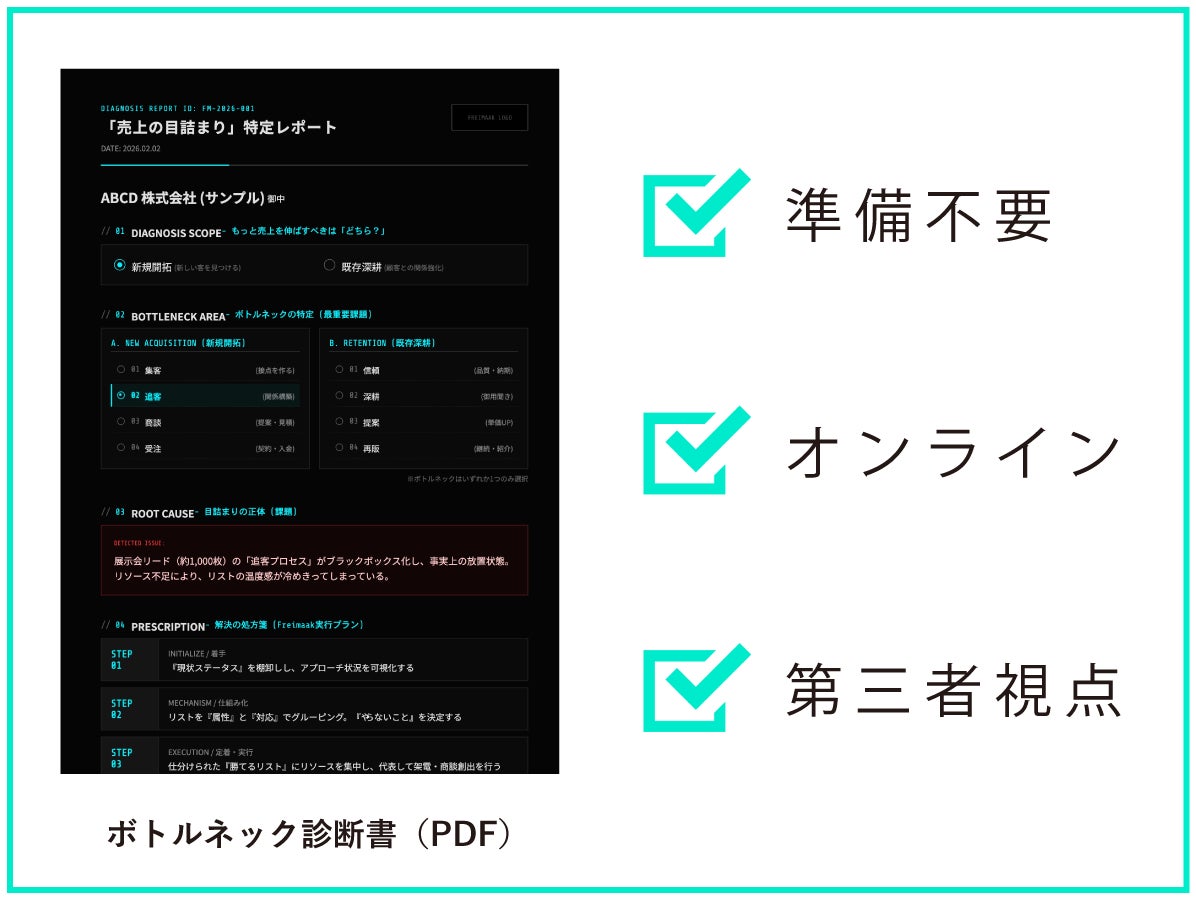 最高密度の戦略品質を維持するため、一度に深く関われる社数には限りがございます。そのため、まずは無料の「ボトルネック診断(60分)」を通じて、私たちが提供する機能が貴社の勝利に最大限貢献できるかを確認してください。