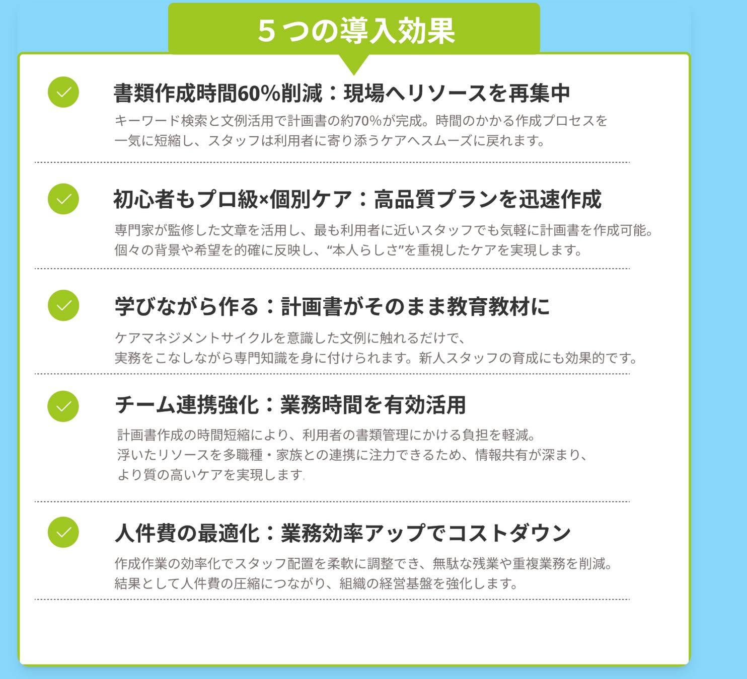 Care Smilyの真価は、効率化と質の担保を両立している点にあります。単に時間を短縮するだけでなく専門家監修の文例を使うことで書類の質と法令遵守を確保。これはAIの自動生成では難しい部分です。