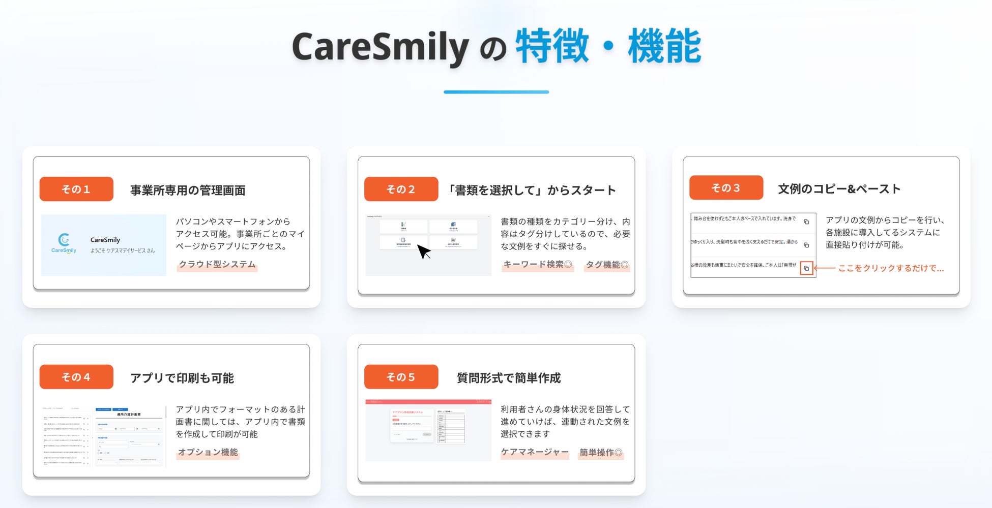 「AIが自動生成した不確かな文章よりも現場で実際に使われてきた確かな文例を選ぶ方がはるかに効率的で安心できる」というのがCare Smilyの基本思想です。