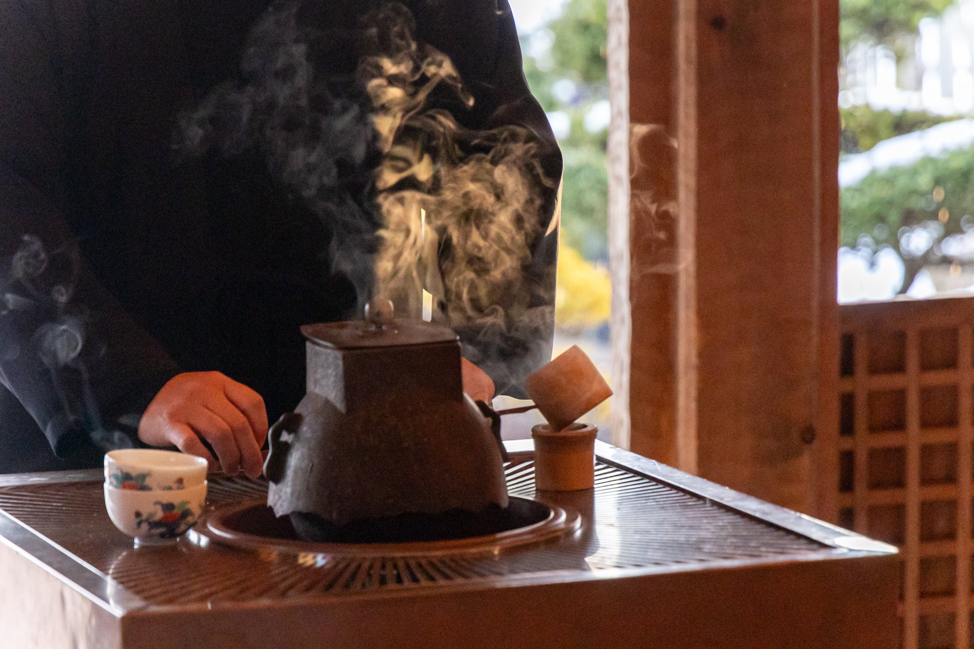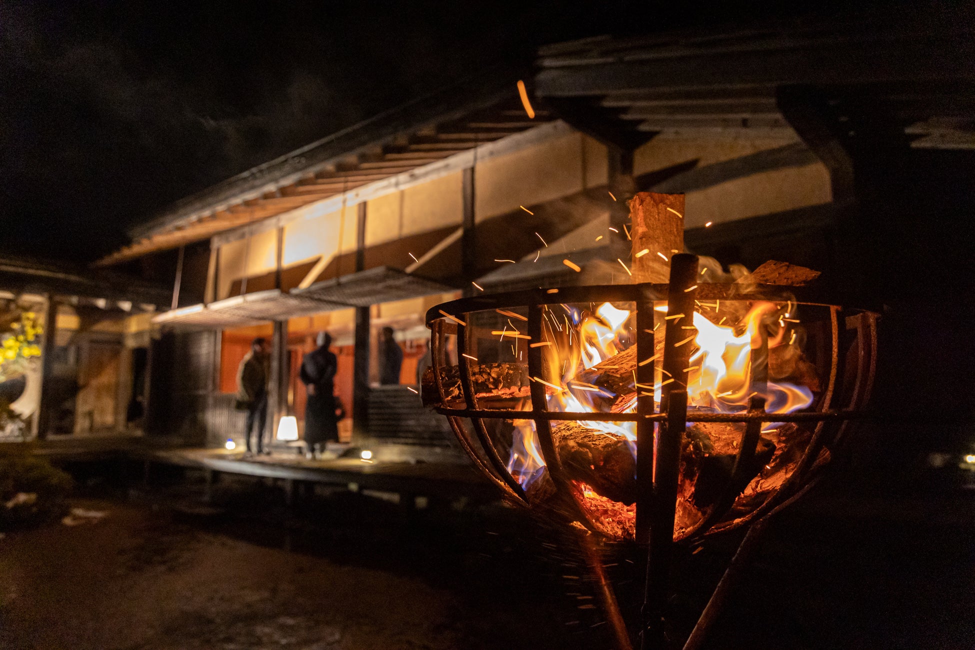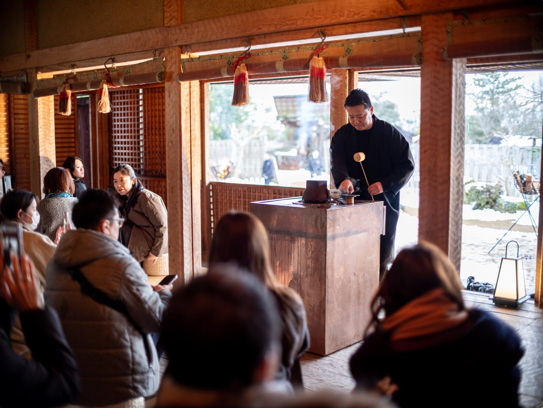 ウェルカム会場は星空保護区の中心地「美星天文台」に隣接する中世の街並みを再現した中世夢が原にある、城主の館にて開催。福岡より茶司徳淵氏をお招きし、玉露と二煎茶、茶菓子でレストラン参加者をおもてなし。雪に彩られた里山の夕暮れが幻想的でした