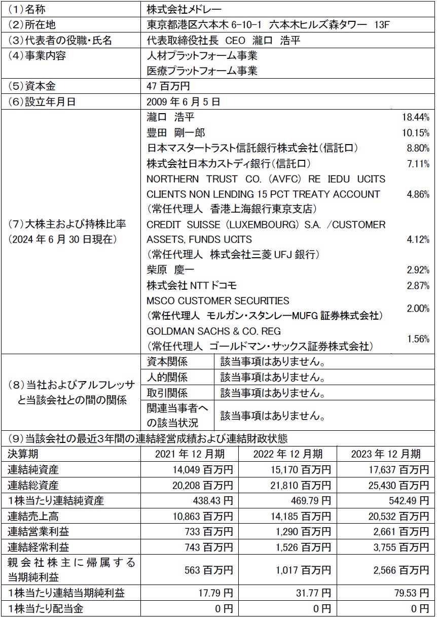 当社の子会社であるアルフレッサ株式会社(本社:東京都千代田区、代表取締役社長:福神雄介、以下「アルフレッサ」といいます)は、株式会社メドレー(東京都港区、代表取締役社長 CEO:瀧口浩平、以下「メドレー」といいます)との間で業務資本提携契約を締結しましたので、下記のとおりお知らせいたします。本提携は、メドレーを株式交換完全親会社、アルフレッサが株式を保有するアクシスルートホールディングス株式会社(本社:東京都千代田区、代表取締役:近藤一馬、以下「アクシスルートホールディングス」といいます)を株式交換完全子会社とする株式交換(以下「本件株式交換」といいます)の効力発生により、その対価としてメドレー株式の取得を伴うものです。