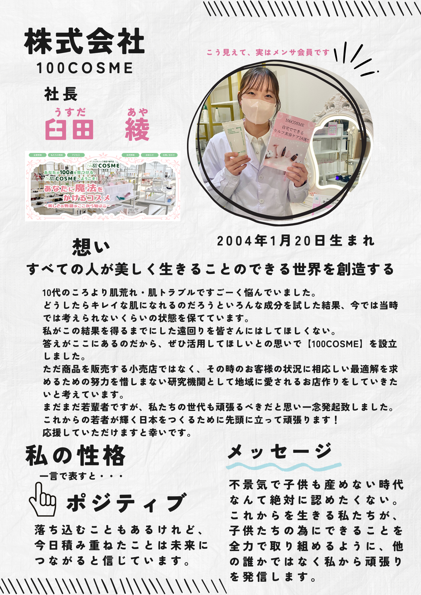 私は20歳で経営者となり、そして今、NPO法人を立ち上げる準備を進めています。なぜなら、女性が自分の人生を自由に選び、経済的に自立し、夢を実現できる社会こそ、これからの日本に求められる豊かで美しい社会だと信じているからです。