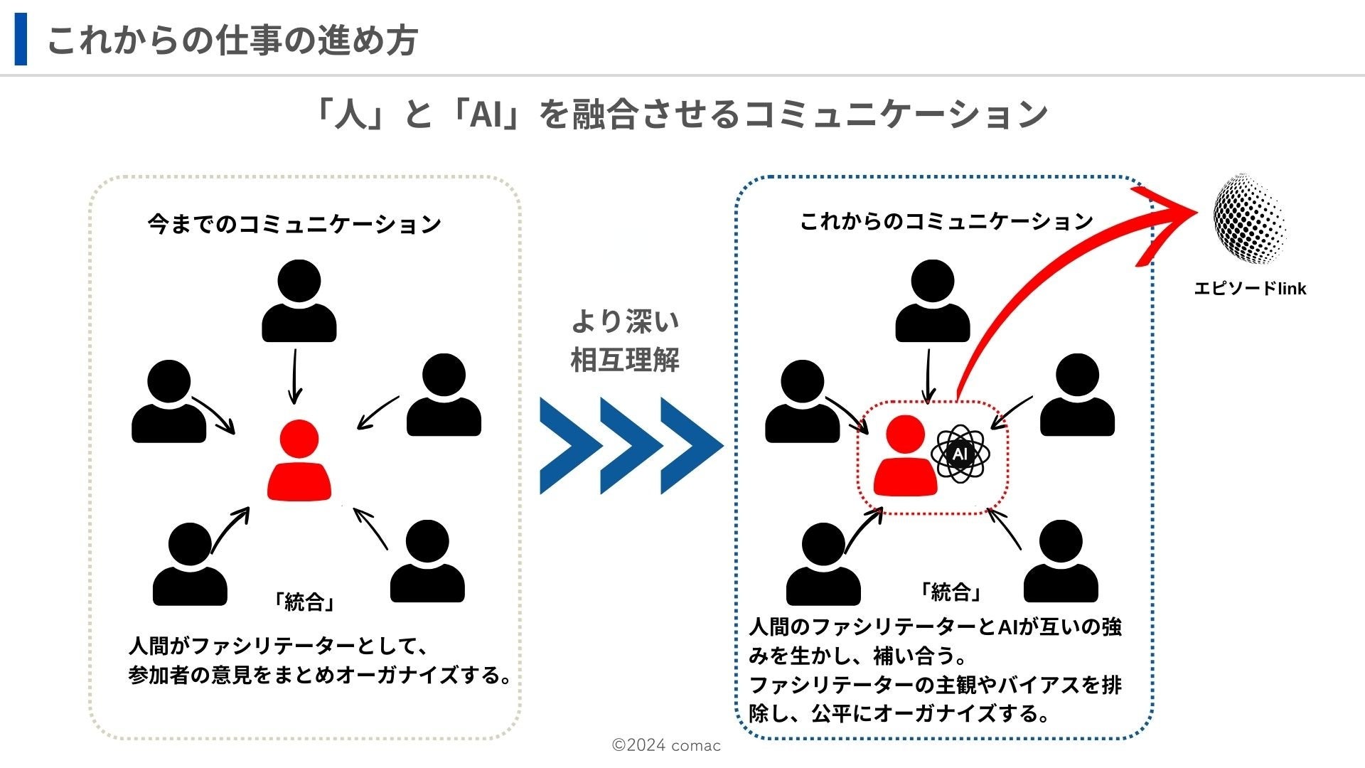 「エピソードlink」は、AIを活用して対話の可能性を最大化する技術であり、顧客接点の価値を抜本的に変革する力を秘めています。特に、顧客接点を大切にするコミュニケーション事業者にとって、従来型のアプローチを超えた革新的なビジネスモデルを実現する鍵となるでしょう。