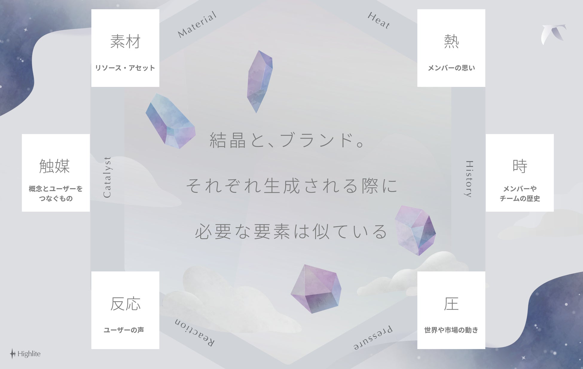 わたしたちHighliteは、この共通点から、新規事業や法人立ち上げの際に、まず言語化やデザインでブランドに関わる要素の定義を行なっていくプロセスを整理し、「結晶化ブランディング」と名付け、ブランディングの手法として取り入れております。