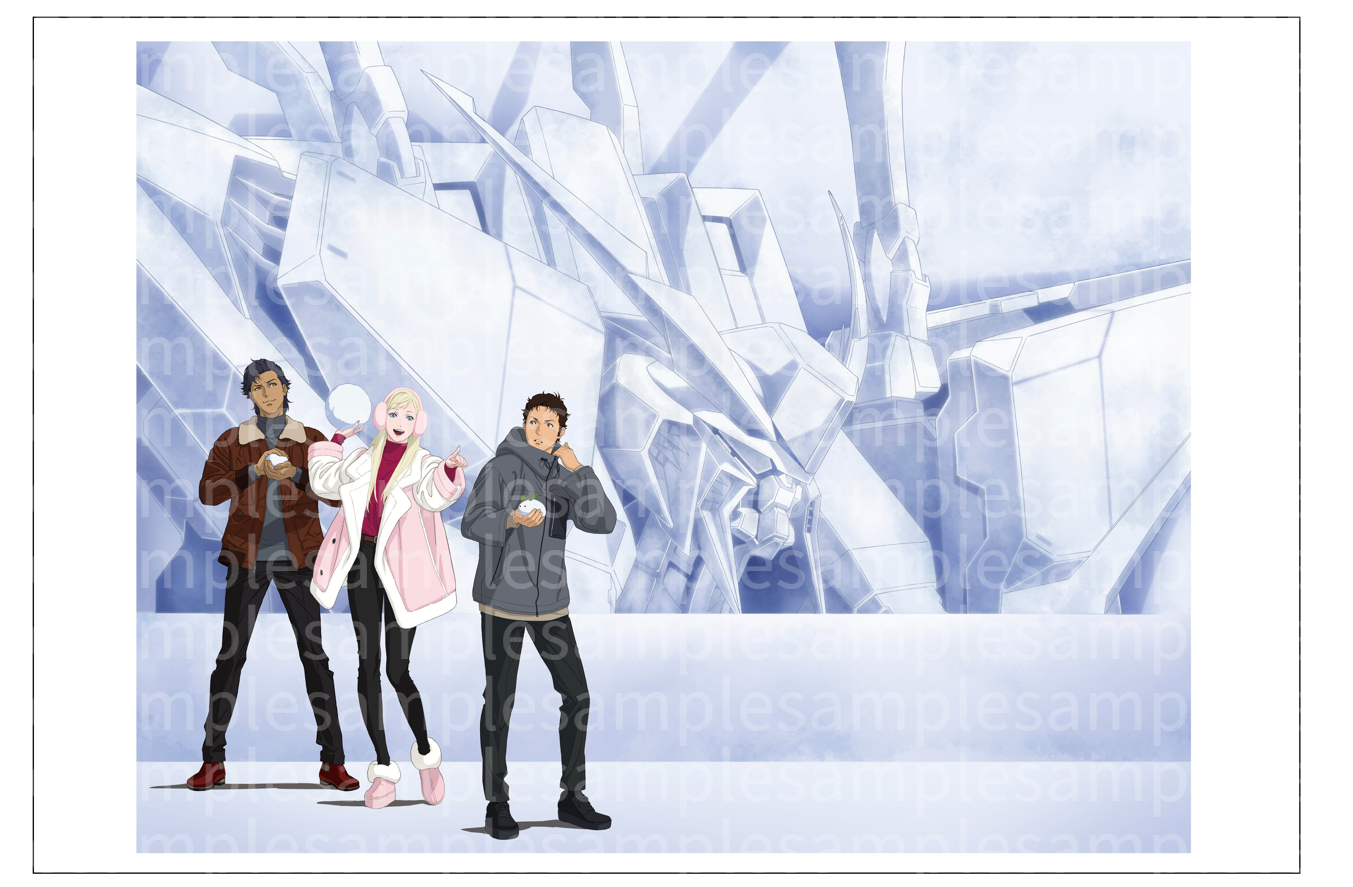 さらに、ご好評とご期待をいただいているコラボ商品に「シャア専用コアップガラナ 3本セット」が追加され、雪まつり会場内ガンダムブースでの販売ラインアップが確定いたしました。また、物販ブースにて税込3,000円以上お買い上げいただいた方に、描き下ろしビジュアルを使用したイラストカードをプレゼントいたします。