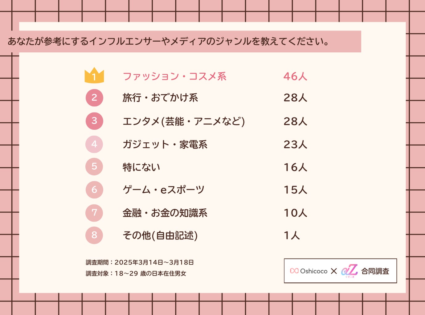 また、参考にしているインフルエンサーやメディアのジャンルとしては、「ファッション・コスメ」「旅行・おでかけ系」が上位にランクイン。常日頃から情報収集をしているようなジャンルにおいて、インフルエンサーやメディア投稿を参考にしているようです。