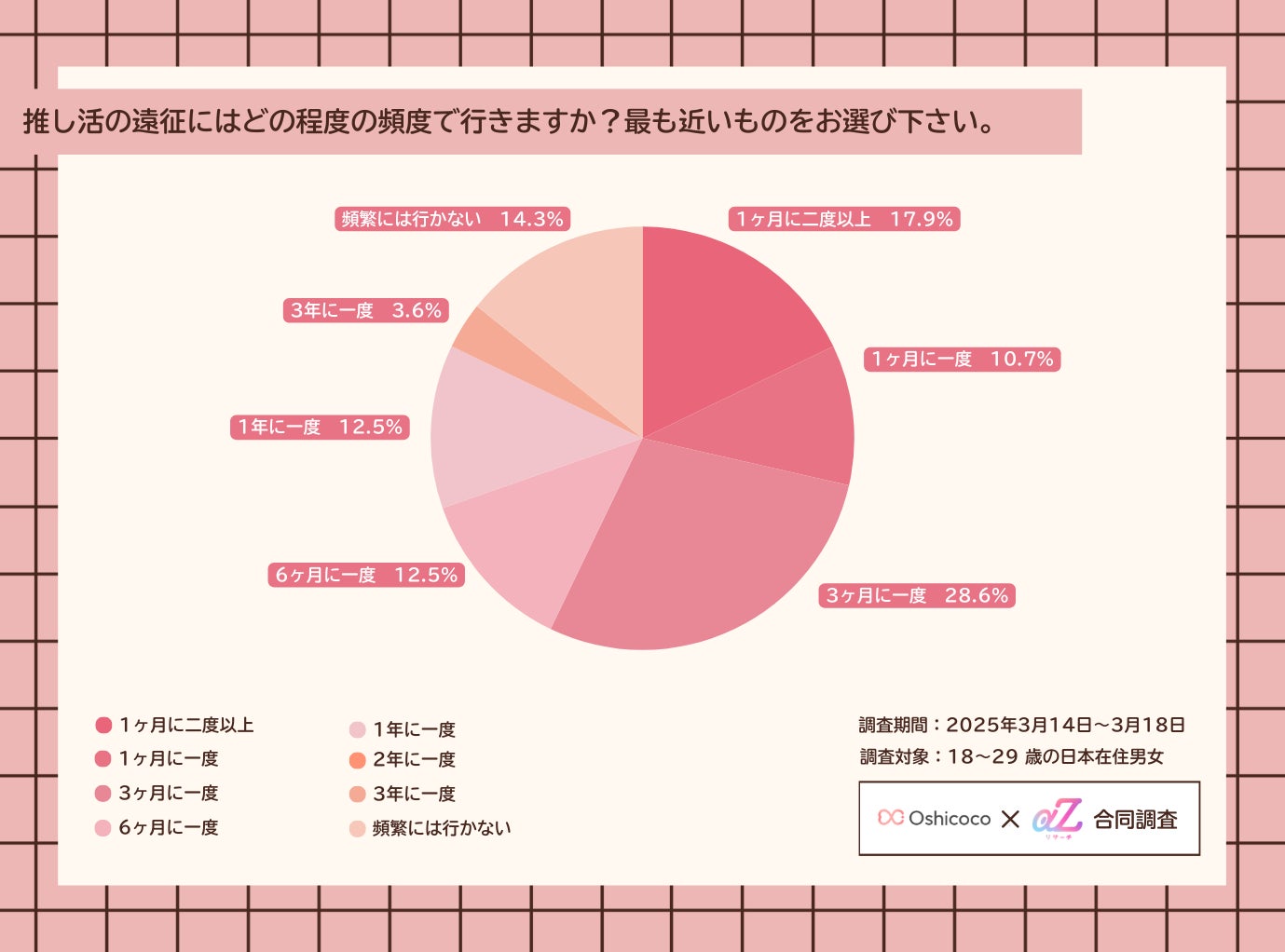 推し活をしている方々を対象とした、推し活遠征についての回答では、1ヵ月~3ヵ月の間に1回以上遠征していると答えた割合が約6割、回答者の2人に1人が頻繁に推し活遠征をしているという結果に。