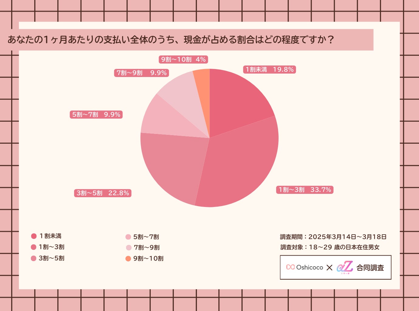 回答者の2人に1人(53.5%)が1ヵ月の支出において、現金が占める割合は30%未満と回答。