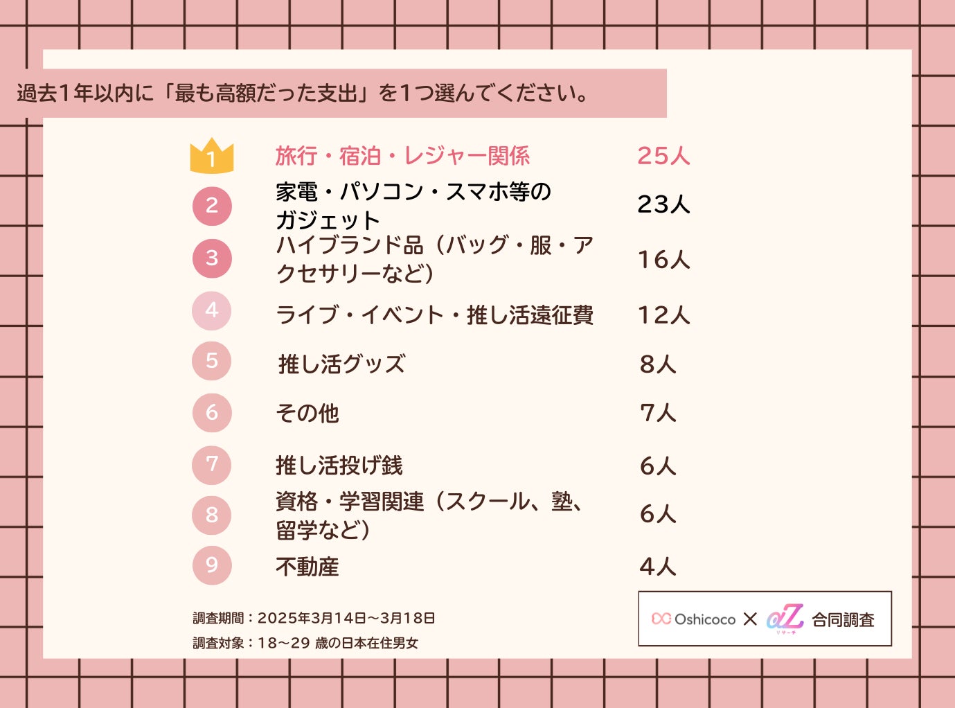 3、4番目に続く「ハイブランド品(バッグ・服・アクセサリーなど)」と「ライブ・イベント・推し活遠征費」が僅差に。次に「推し活グッズ」が続く形になりました。