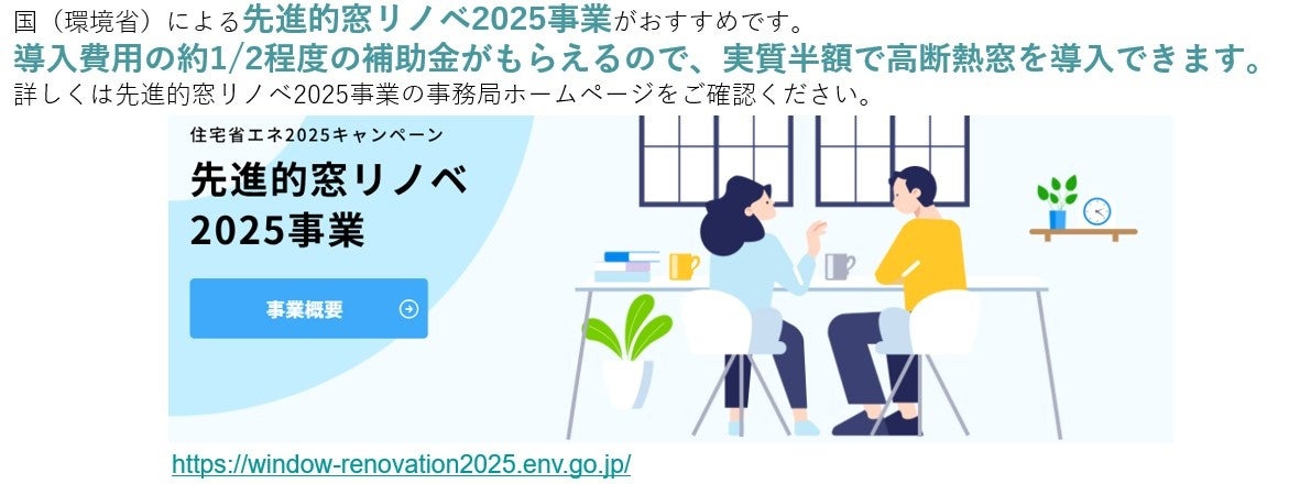 また、現在公募中である環境省による「先進的窓リノベ2025事業」を活用すると、窓改修工事費のおよそ半額程度の補助金を受けることが出来るので、実質的な費用負担を抑えて高断熱窓を導入することが可能です。