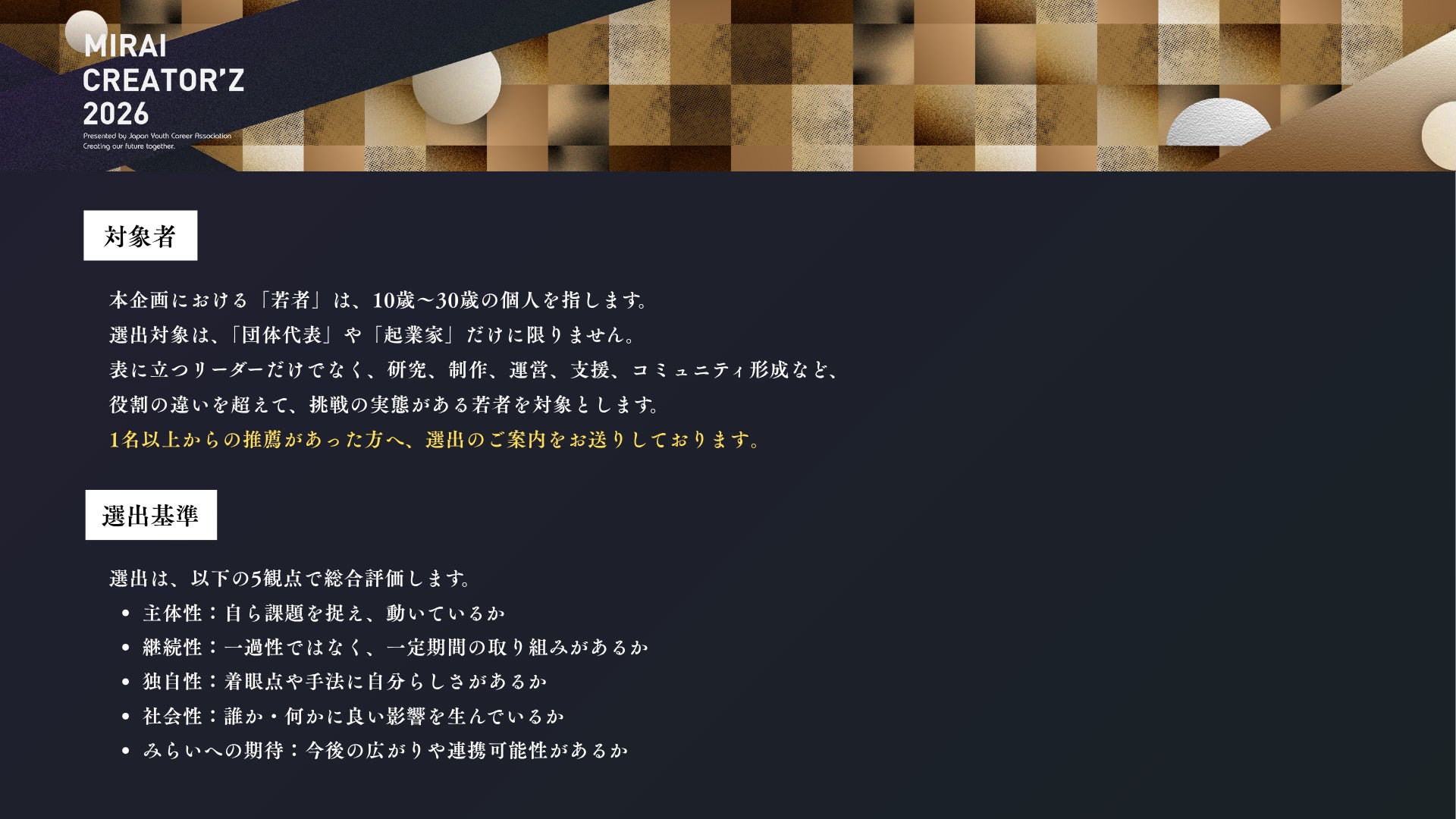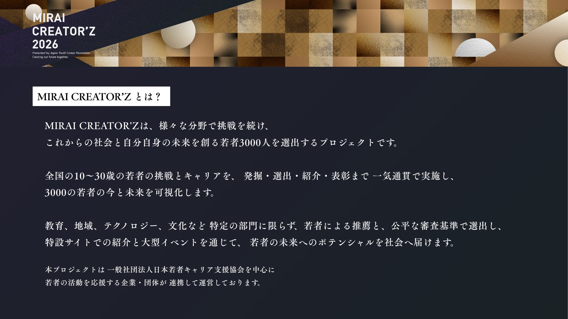 一般社団法人日本若者キャリア支援協会(以下、JYC)は、未来を創る若者の才能を可視化する表彰企画「MIRAI CREATOR'Z 2026」を選出いたします。