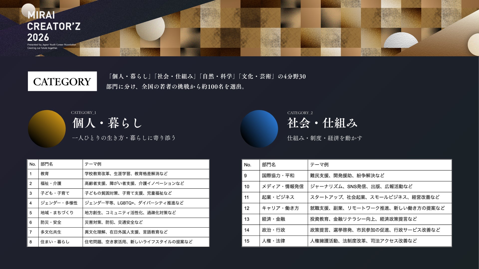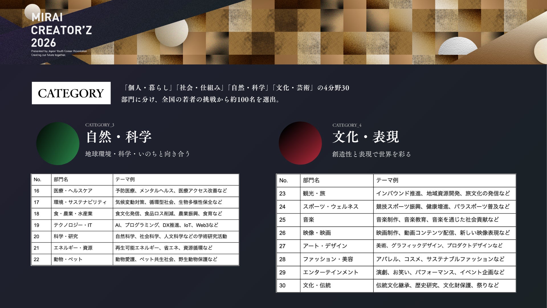 本プロジェクトでは、教育、福祉、地域づくり、起業、テクノロジー、研究、アート、伝統文化など、多様な分野で活躍する若者を対象に、30部門・計3,000人を選出予定です。2026年9月には、各部門を代表するTOP CREATOR’Zを表彰する1,000人規模のイベントの開催も予定しています。