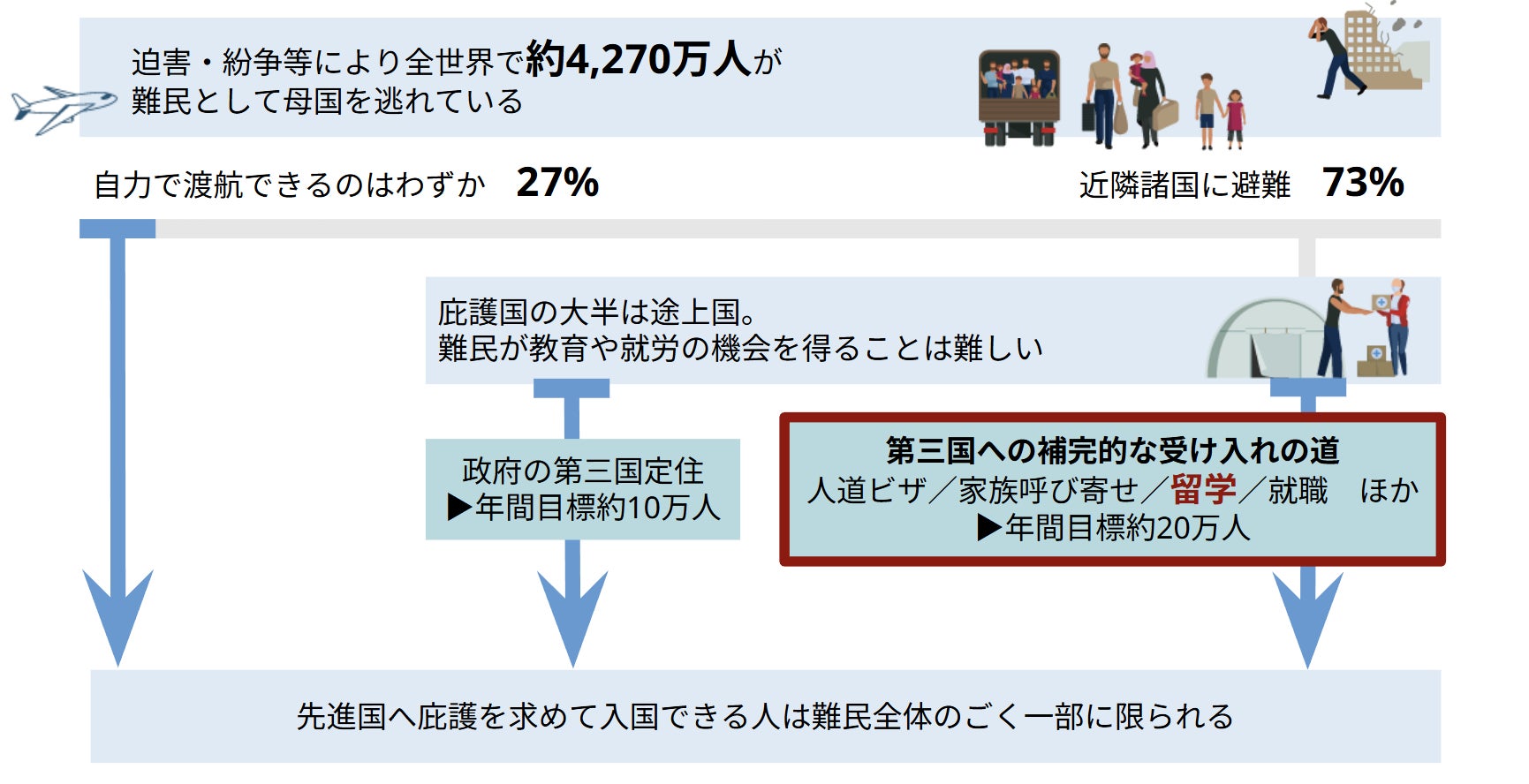 教育パスウェイズ等の民間主導の難民・避難民の受け入れプログラムは、1980年代にカナダで始まった取り組みを起点に、近年国際的な広がりを見せています。2018年に国連総会で採択された「難民に関するグローバル・コンパクト」では、各国政府による第三国定住を補完する道筋として位置づけられ、各国で導入・拡大が推奨されています。さらに、2023年に開催された「第2回グローバル難民フォーラム」では、以後5年間で20万人の難民を教育や就労を通じて受け入れるという共通目標が宣言されました。