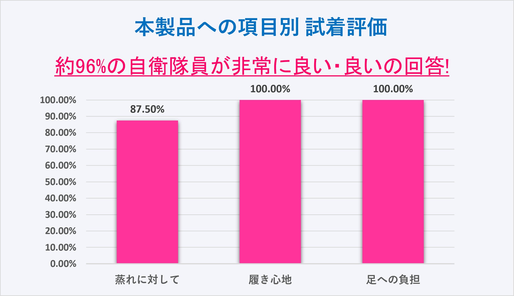 そこで自衛隊 現役普通科連隊に本製品の試着テストを行いました。結果、96%の方が、蒸れ・履き心地・足への負担といった評価項目において、「良い・非常に良い」との回答がありました。