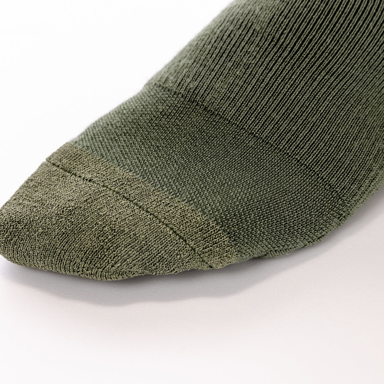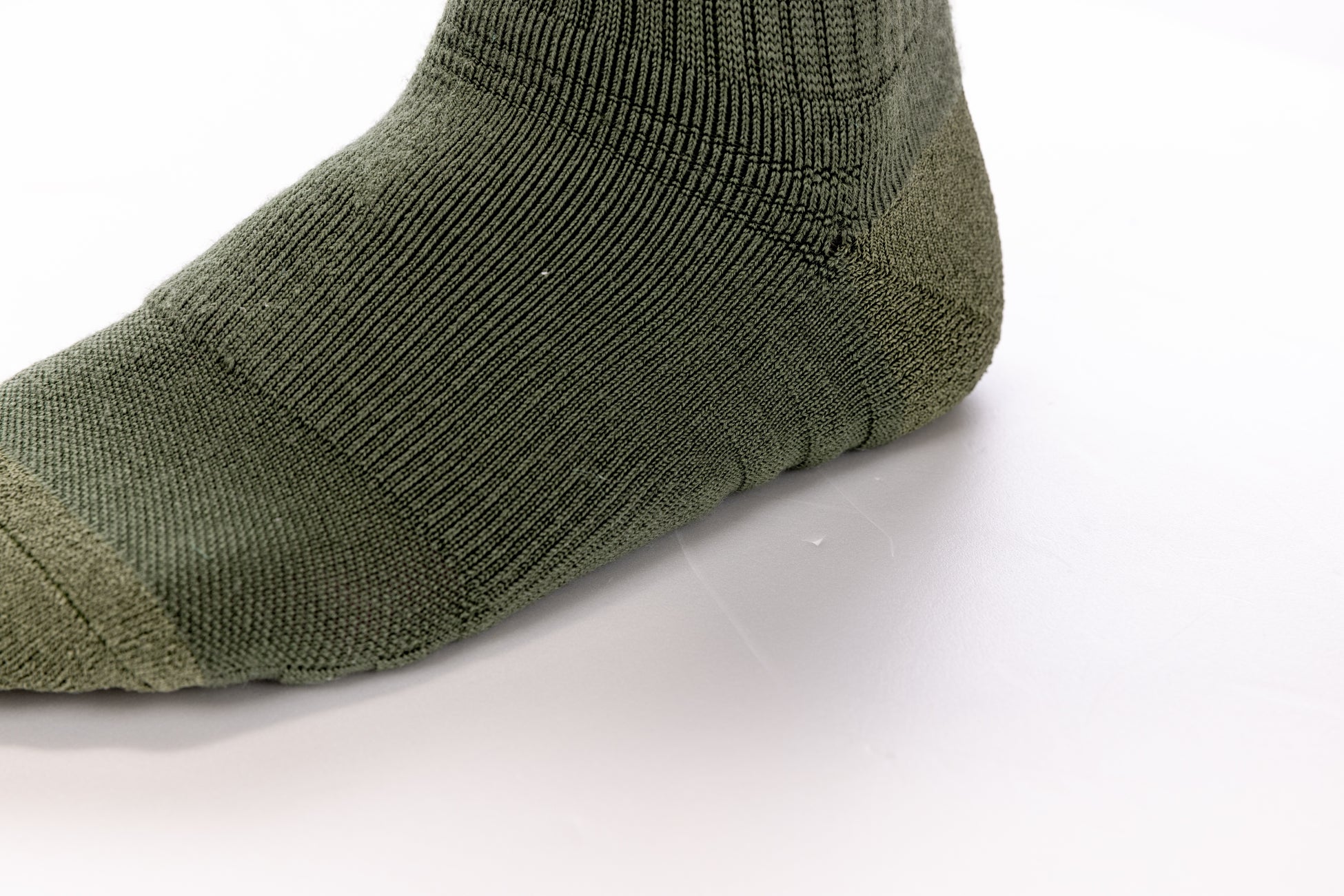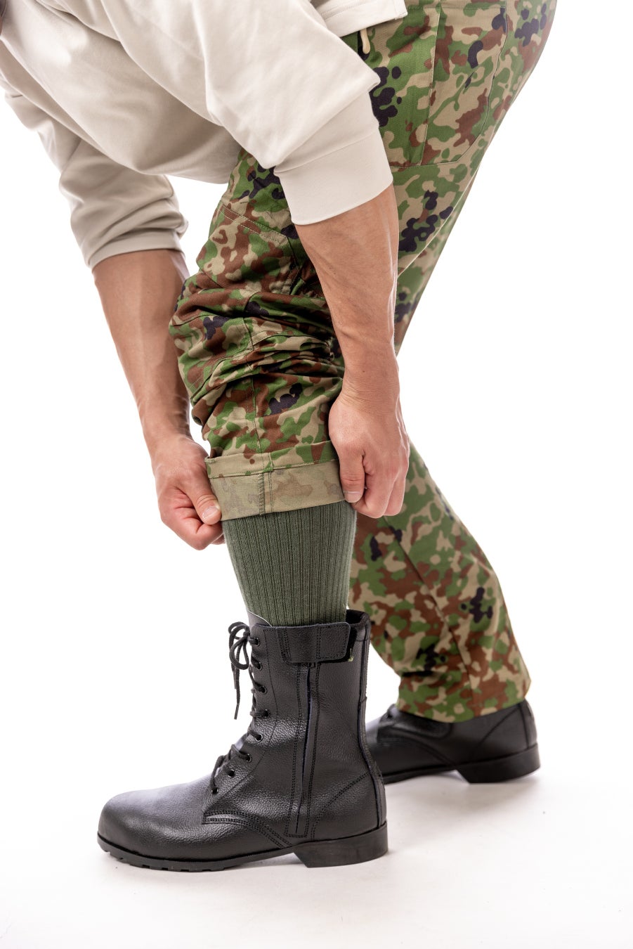 本製品は、現役自衛隊員にリサーチを行い、約2年の開発と着用テストを経て、誕生した日本製タクティカルソックス(軍用ソックス)です。自衛隊員の悩みの種=長期間の過酷な行軍・訓練で直面する、白癬菌(カビ)・蒸れ・足への負担を改善するために開発されました。日本製薬剤による抗白癬菌加工を施し、最高級メリノウール×和紙糸、ベンチレーションパイル×甲部メッシュの、ハイブリッド素材・構造により、吸湿放湿性と保温性を両立し、クッション性も兼ね備える事で、過酷な環境下でも快適な履き心地を提供します。