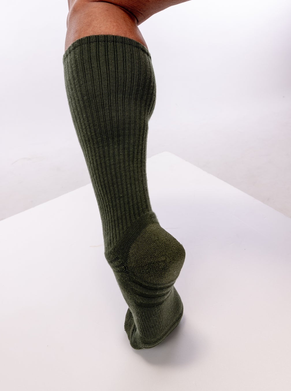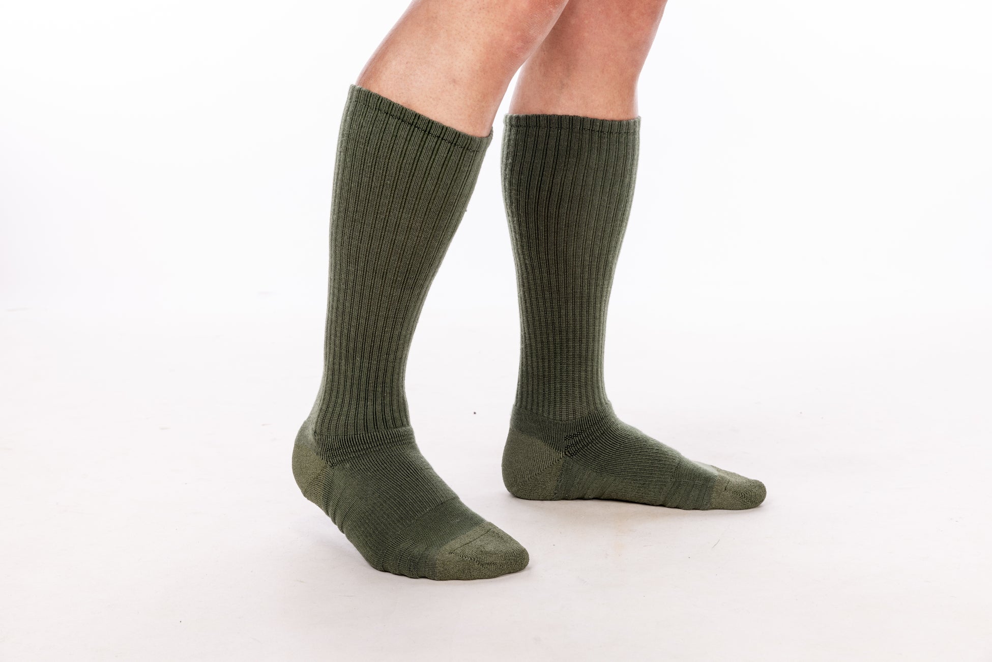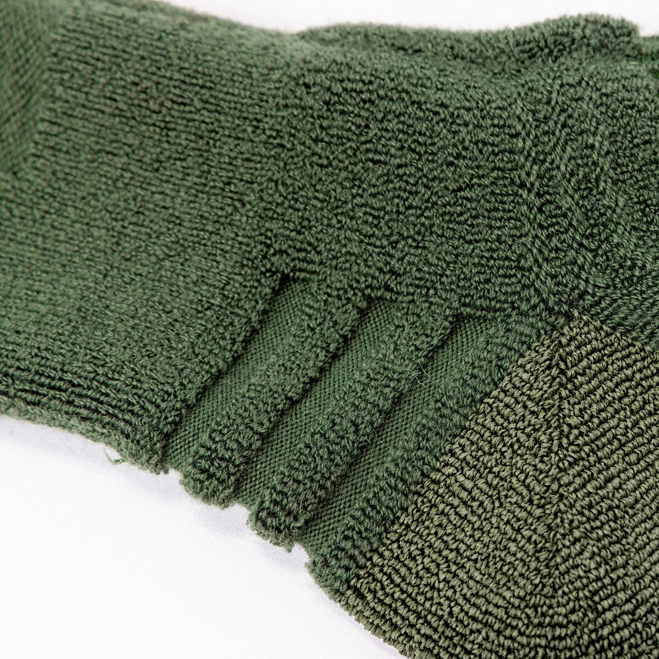 本製品は、現役自衛隊員にリサーチを行い、約2年の開発と着用テストを経て、誕生した日本製タクティカルソックス(軍用ソックス)です。自衛隊員の悩みの種=長期間の過酷な行軍・訓練で直面する、白癬菌(カビ)・蒸れ・足への負担を改善するために開発されました。日本製薬剤による抗白癬菌加工を施し、最高級メリノウール×和紙糸、ベンチレーションパイル×甲部メッシュの、ハイブリッド素材・構造により、吸湿放湿性と保温性を両立し、クッション性も兼ね備える事で、過酷な環境下でも快適な履き心地を提供します。