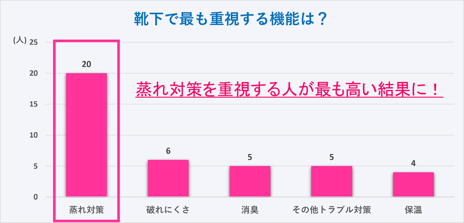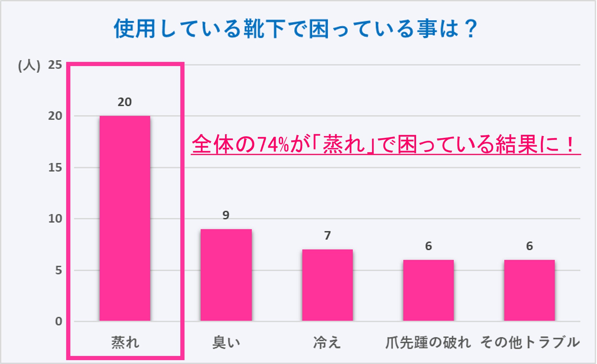 実際に、調査集計から、「使用している靴下で困っている事」と「靴下で最も重視する機能」としては全体の約74%が「蒸れ」に関する回答をしています。