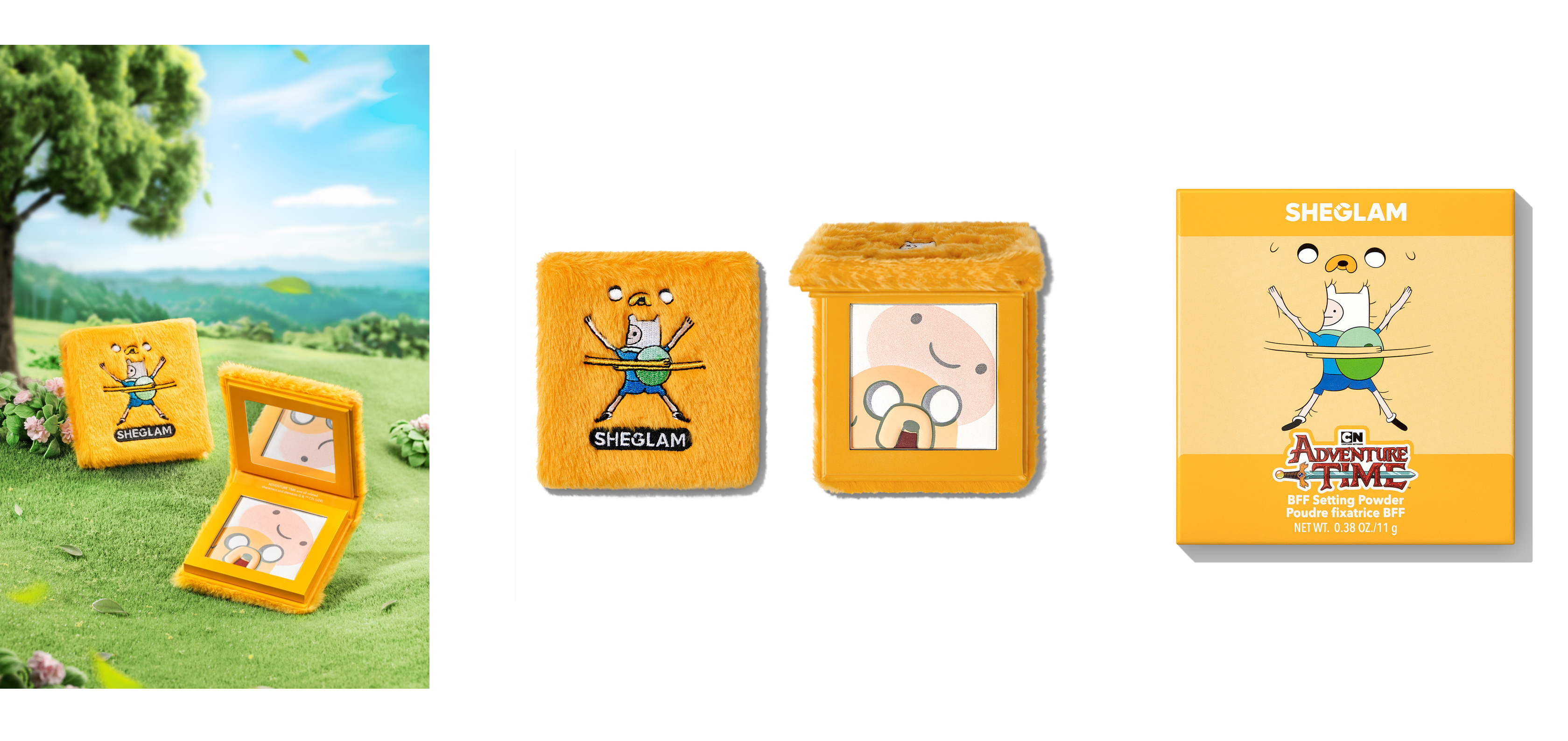 さらに、フィンとジェイクをイメージしたセッティングパウダー「BFF Setting Powder」は、軽やかな付け心地で肌にフィットし、メイクの仕上げにおすすめのアイテムです。また、ビーモをあしらった可愛らしいメイクポーチ「Be MOre Makeup Bag」など、SHEGLAMとのコラボコレクション限定アイテムをご用意しています。